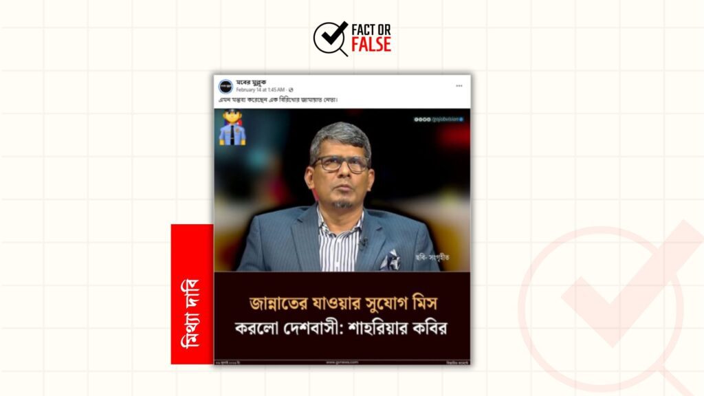 সম্প্রতি,‘জান্নাতে যাওয়ার সুযোগ মিস করলো দেশবাসী: শাহরিয়ার কবির’ শীর্ষক শিরোনামে একটি ফটোকার্ড সামাজিক যোগাযোগমাধ্যমে প্রচার করা হয়েছে। দেখুন…