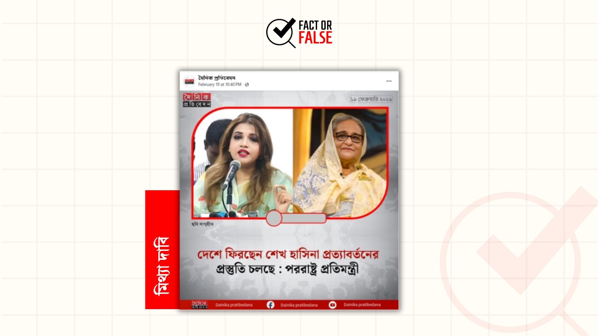 “দেশে ফিরছেন শেখ হাসিনা প্রত্যাবর্তনের প্রস্তুতি চলছে: পররাষ্ট্র প্রতিমন্ত্রী” শিরোনামে পররাষ্ট্র প্রতিমন্ত্রী শামা ওবায়েদের মন্তব্য দাবিতে একটি ফটোকার্ড…
