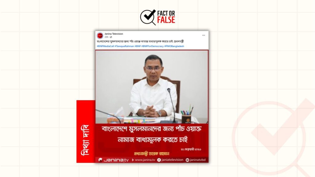 সম্প্রতি, “বাংলাদেশে মুসলমানদের জন্য পাঁচ ওয়াক্ত নামাজ বাধ্যমূলক করতে চাই” শীর্ষক মন্তব্য প্রধানমন্ত্রী তারেক রহমান করেছেন দাবিতে একটি ফটোকার্ড প্রচার