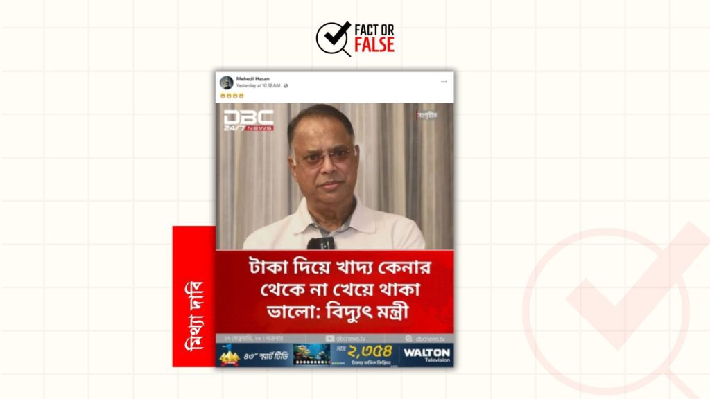 “টাকা দিয়ে খাদ্য কেনার থেকে না খেয়ে থাকা ভালো: বিদ্যুৎ মন্ত্রী’” শিরোনামে ডিবিসি নিউজের ডিজাইন সংবলিত একটি ফটোকার্ড প্রচার করা