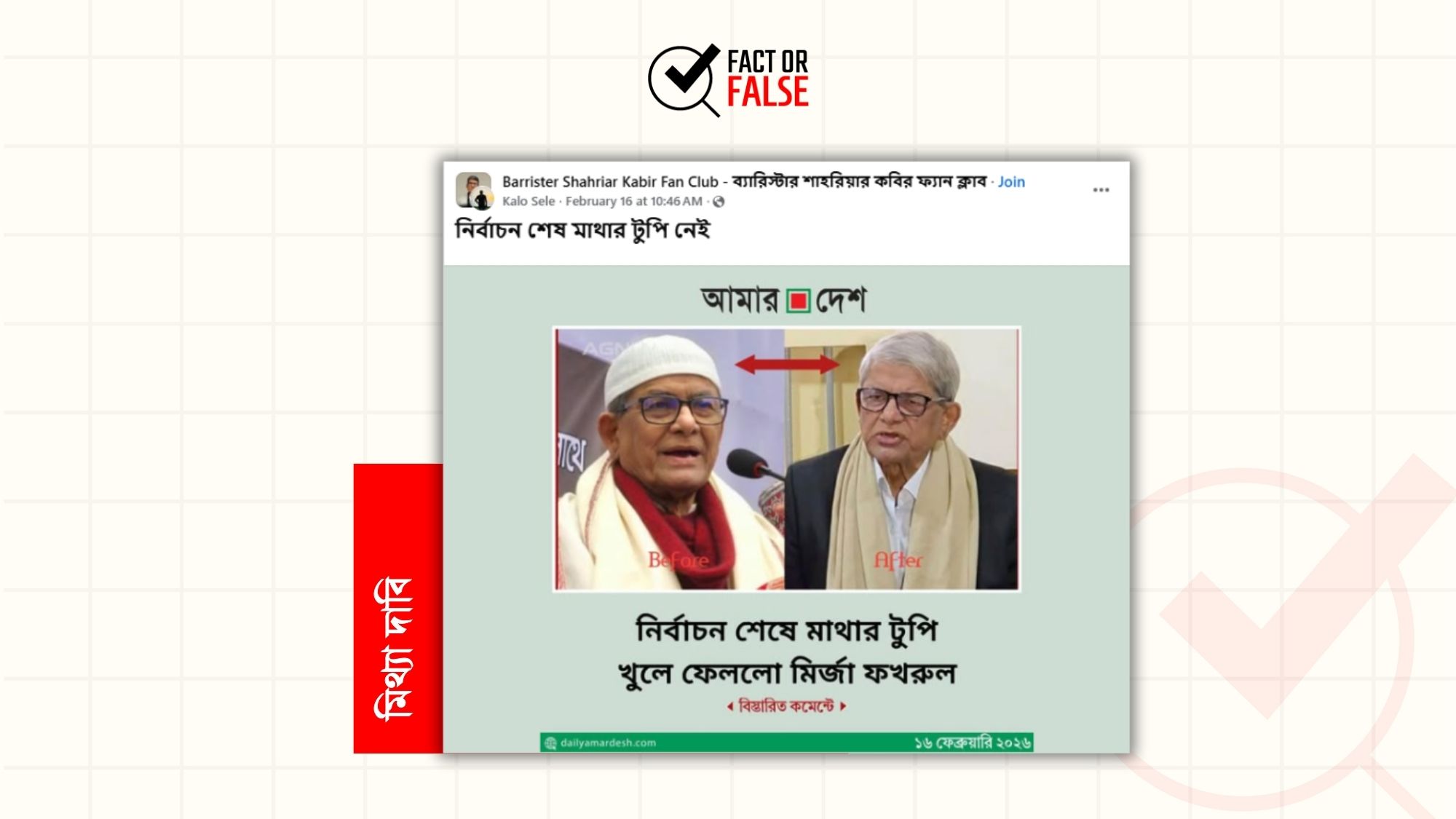 সম্প্রতি, “নির্বাচন শেষে মাথার টুপি খুলে ফেললো মির্জা ফখরুল” শিরোনামে সংবাদমাধ্যম আমার দেশের ডিজাইন সংবলিত একটি ফটোকার্ড সামাজিক…