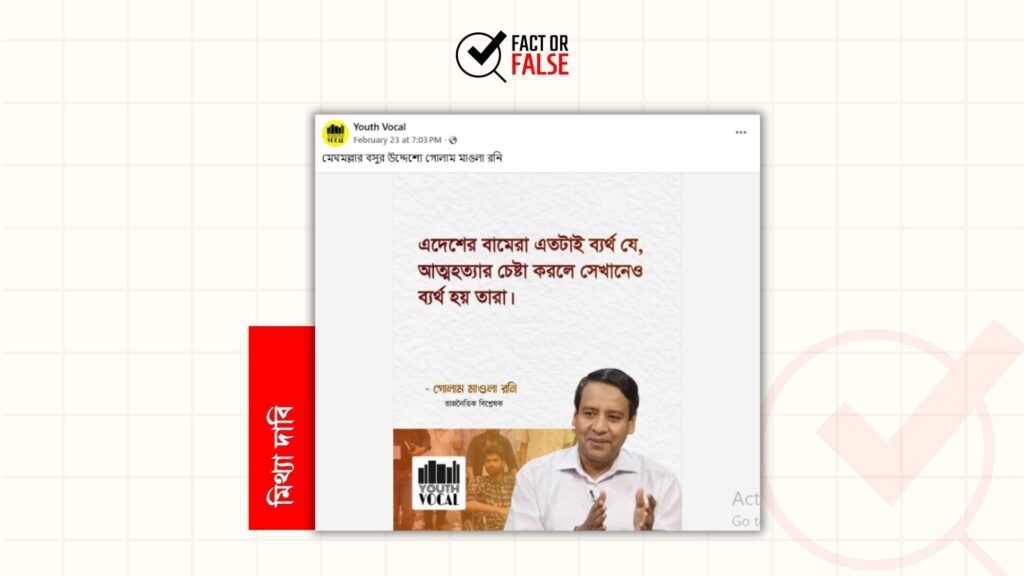 সম্প্রতি, “এদেশের বামেরা এতটাই ব্যর্থ যে, আত্মহত্যার চেষ্টা করলে সেখানেও ব্যর্থ হয় তারা।” শিরোনামে রাজনৈতিক বিশ্লেষক গোলাম মাওলা রনিকে উদ্ধৃতি