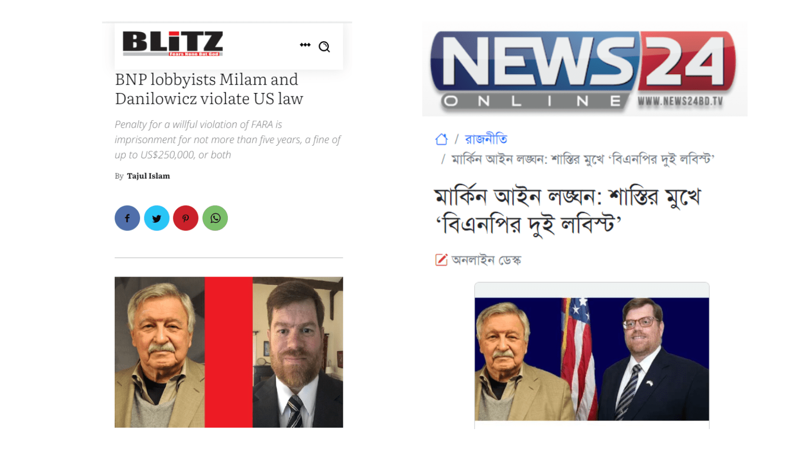 মূলত লবিস্ট হিসেবে নিজেদের নিবন্ধন ভুক্ত না করে লবিস্টের ভূমিকা পালন করায় তারা কিভাবে মার্কিন আইন লঙ্ঘন করছেন ও এর শাস্তি কী সে সম্পর্কে ব্যাখ্যা দেওয়া হয়েছে প্রতিবেদনে। এছাড়া তারা বাংলাদেশে উগ্র ইসলামপন্থীদের পক্ষে ভূমিকা রাখছেন বলেও দাবি করা হয়েছে এতে। তবে তারা আইনের মুখোমুখি হয়েছেন বা শাস্তি পেতে যাচ্ছেন এমন কিছুই দাবি করা হয়নি উইকলি ব্লিটজের প্রতিবেদনে।