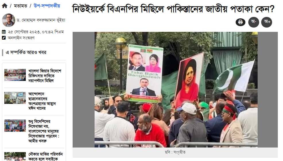 The headline of a sub-editorial published on the Daily Kalbela online on September 25, 2023, by Dr. Mohammad Badruzzaman Bhuiyan, the Treasurer of Barishal University reads: “Why Did BNP Carry Pakistan’s Flag in Their Rally in New York?” In the article, he writes, “In the wake of various allegations, including demanding the release of BNP Chairperson Khaleda Zia in corruption cases and seeking advanced medical treatment abroad, the BNP staged a protest in the United States last Friday (September 22).The sight of the Pakistani flag at a protest in front of the United Nations headquarters in Manhattan, New York has raised questions among Bengalis about why and how some people came to participate in the demonstration displaying the Pakistani flag?”