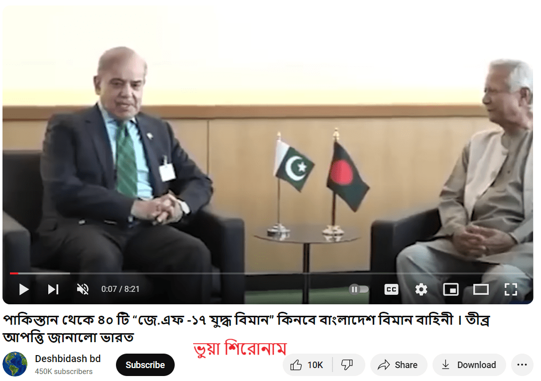 বাংলাদেশ পাকিস্তান থেকে ৪০টি জেএফ১৭ যুদ্ধ বিমান কেনার চুক্তি করেছে দাবি করে ইউটিউবে ভিডিও তৈরি করেছে কয়েকটি চ্যানেল। ইতিমধ্যে চ্যানেলগুলোতে কয়েক লাখ দর্শক দেখেছেন এসব ভিডিও।