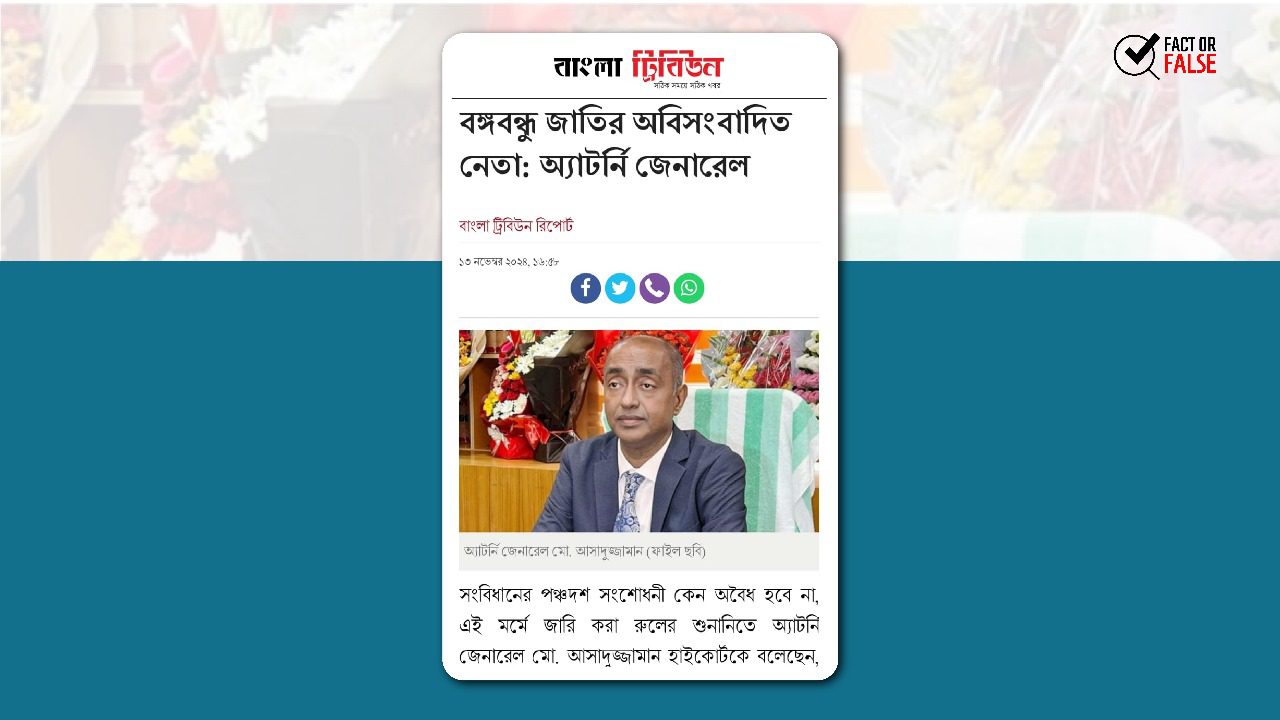 খবরিটির শুরুতেই পোর্টালটি লিখেছে, “অ্যাটর্নি জেনারেল মো. আসাদুজ্জামান হাইকোর্টকে বলেছেন, বঙ্গবন্ধু শেখ মুজিবুর রহমান অবিসংবাদিত জাতীয় নেতা, এটা অস্বীকারের সুযোগ নেই। কিন্তু তাকে একটি দল দলীয়করণের চেষ্টা করেছিল।”