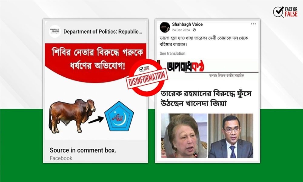 গত ২৪ ডিসেম্বর Department of Politics: Republic of Bangladesh নামের একটি পেইজ থেকে “শিবির নেতার বিরুদ্ধে গরুকে ধর্ষণের অভিযোগ!” শিরোনামে একটি ফটোকার্ড পোস্ট করা হয়। সূত্র হিসেবে মন্তব্যের ঘরে অপরাধকন্ঠ নামের একটি ওয়ার্ডপ্রেস পোর্টালের লিংক দেয়া হয়।