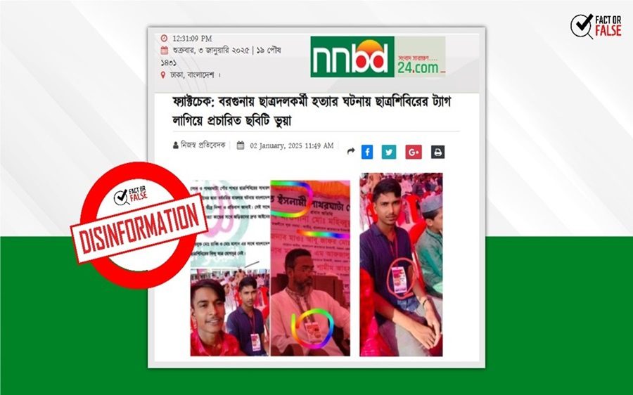 পোর্টালটির ফ্যাক্টচেক প্রতিবেদনে সাংবাদিক শাহেদ আলমের পোস্ট করা ছবি বিশ্লেষণ করে দাবি করা হয়েছে পাথরঘাটায় জামায়াতের সমাবেশের ছবিতে জামায়াত নেতার গলায় থাকায় ডেলিগেট কার্ডের ডিজাইন এবং রাব্বি ও হাসানের ছড়িয়ে পড়া ছবিতে তাদের গলায় থাকা ডেলিগেট কার্ডের ডিজাইন ভিন্ন।
