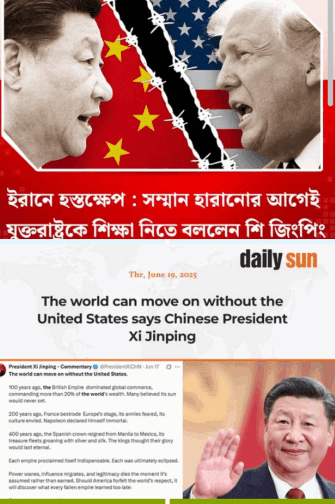 উক্ত দাবিটি প্রচার করতে তথ্যের উৎস হিসেবে মূলত President Xi Jinping- Commentary নামের এক্স (পূর্বের টুইটার) এর একটি অ্যাকাউন্টের পোস্টকে উল্লেখ করেছে। বাংলাদেশি পত্রিকা কালবেলার প্রতিবেদনে বলা হয়েছে, শি জিনপিং যুক্তরাষ্ট্রকে সতর্ক করে দিয়ে বলেছেন, বিশ্ব যুক্তরাষ্ট্র ছাড়া এগিয়ে যেতে পারে, এবং অতীতের সাম্রাজ্যবাদী শক্তিগুলির অভিজ্ঞতা উল্লেখ করে যুক্তরাষ্ট্রকে সাবধান করেছেন। শুধু তাই নয়, কালবেলা এরও আগে ওই একই অ্যাকাউন্ট থেকে শি জিংপিংকে উদ্ধৃত করে লিখেছে, “যুক্তরাষ্ট্র মধ্যপ্রাচ্যে যুদ্ধ ও পুলিশি কার্যক্রমে আট ট্রিলিয়ন ডলার ব্যয় করেছে। হাজার হাজার আমেরিকান সৈন্য মারা গেছে বা গুরুতরভাবে আহত হয়েছে। অন্যদিকে, লাখ লাখ মানুষ মারা গেছে। মধ্যপ্রাচ্যে যাওয়া (মার্কিনদের) সবচেয়ে খারাপ সিদ্ধান্ত ছিল।”