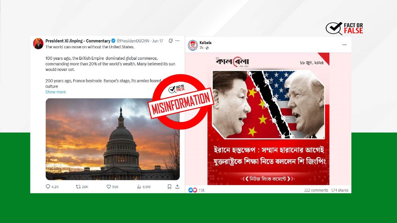 সম্মান হারানোর আগেই যুক্তরাষ্ট্রকে শিক্ষা নিতে বললেন শি জিনপিং—এই শিরোনামে সম্প্রতি সংবাদ প্রকাশ করেছে বাংলাদেশের সংবাদমাধ্যম কালবেলা। ফেসবুকে কালবেলা ও ডেইলি সান পত্রিকার অফিসিয়াল পেইজ থেকেও ফটোকার্ড (,) আকারে তথ্যটি প্রচারিত হয়েছে। এছাড়া শি জিনপিং-এর নামে এমন মন্তব্য ভাইরাল হয়েছে সামাজিক যোগাযোগ মাধ্যমেও। কয়েকটি পোস্ট দেখুন এখানে (, , , , , , )। তবে ফ্যাক্ট অর ফলস এর যাচাইয়ে দেখা যায়, শি জিনপিং এমন কোন মন্তব্য করেননি।