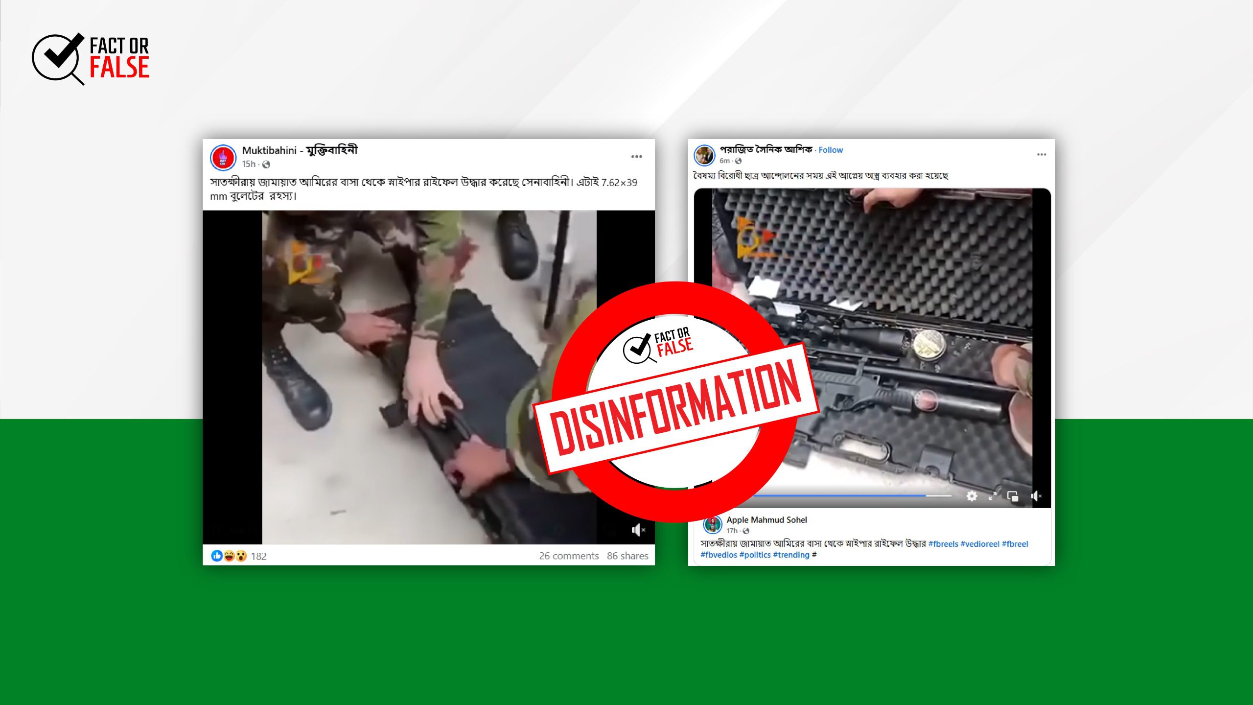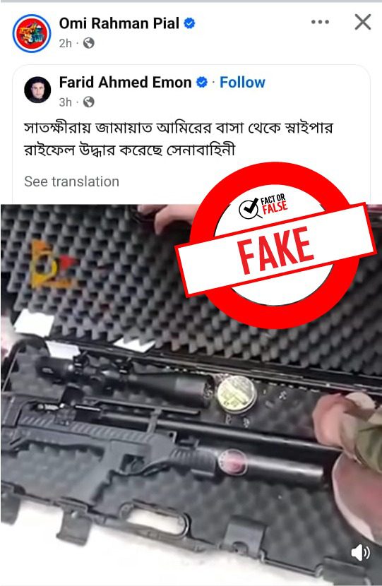সম্প্রতি, ‘সাতক্ষীরায় জামায়াত আমিরের বাসা থেকে স্নাইপার রাইফেল উদ্ধার করা হয়েছে’- শীর্ষক দাবিতে একটি ভিডিও সামাজিক মাধ্যমে প্রচার করা হচ্ছে। ফেসবুকে প্রচারিত এমন কিছু পোস্ট দেখুন এখানে এখানে এখানে।
