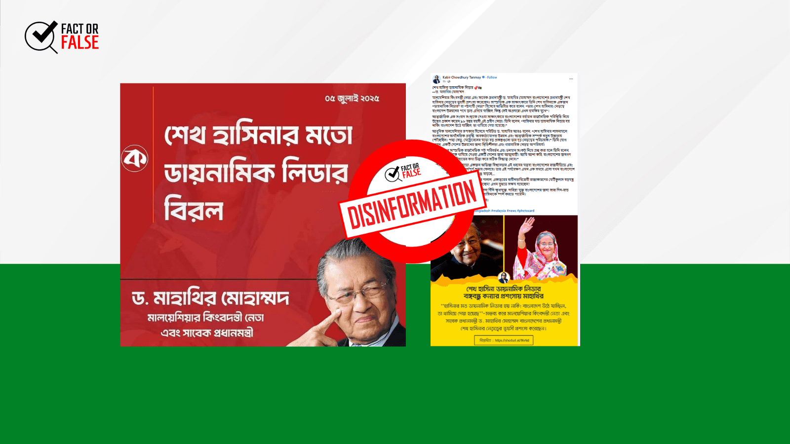 সম্প্রতি সামাজিক মাধ্যম ফেসবুকে একটি দাবি প্রচার করা হচ্ছে যে,“মাহাথির মোহাম্মদ শেখ হাসিনার নেতৃত্বের প্রশংসা করে বলেছেন, শেখ হাসিনার মতো নেতৃত্ব দক্ষিণ এশিয়ায় বিরল”। কিছু পোস্টে মাহাথিরের ছবি সংযুক্ত করে দাবি করা হচ্ছে, “তিনি বলেছেন–শেখ হাসিনার মতো সাহসী নেতা পেলে বাংলাদেশ আরও এগিয়ে যেত”।
