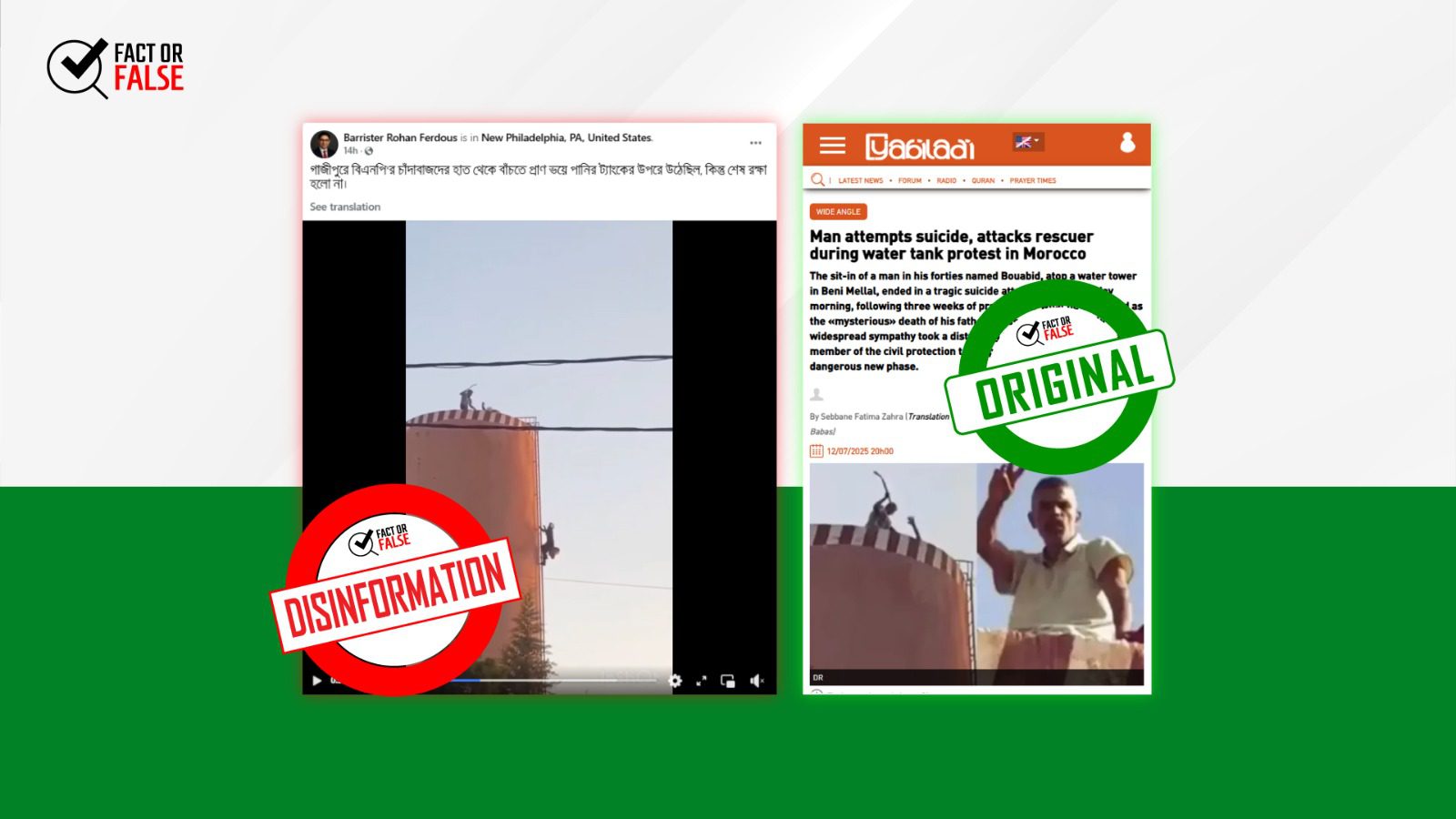 অর্থাৎ, মরোক্কোর একটি জলাধারের উপরে মারধরের ঘটনাকে ‘গাজীপুরে চাঁদাবাজদের হাত থেকে বাঁচতে পানির ট্যাংকে উঠেও রক্ষা পেল না’-শীর্ষক দাবিতে প্রচার করা হয়েছে, যা সম্পূর্ণ মিথ্যা।