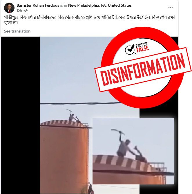 সম্প্রতি, ‘গাজীপুরে চাঁদাবাজদের হাত থেকে বাঁচতে পানির ট্যাংকে উঠেও রক্ষা পেল নাশীর্ষক দাবিতে একটি ভিডিও সামাজিক মাধ্যমে প্রচার করা হচ্ছে। ফেসবুকে প্রচারিত এমন কিছু পোস্ট দেখুন এখানে এখানে এখানে।