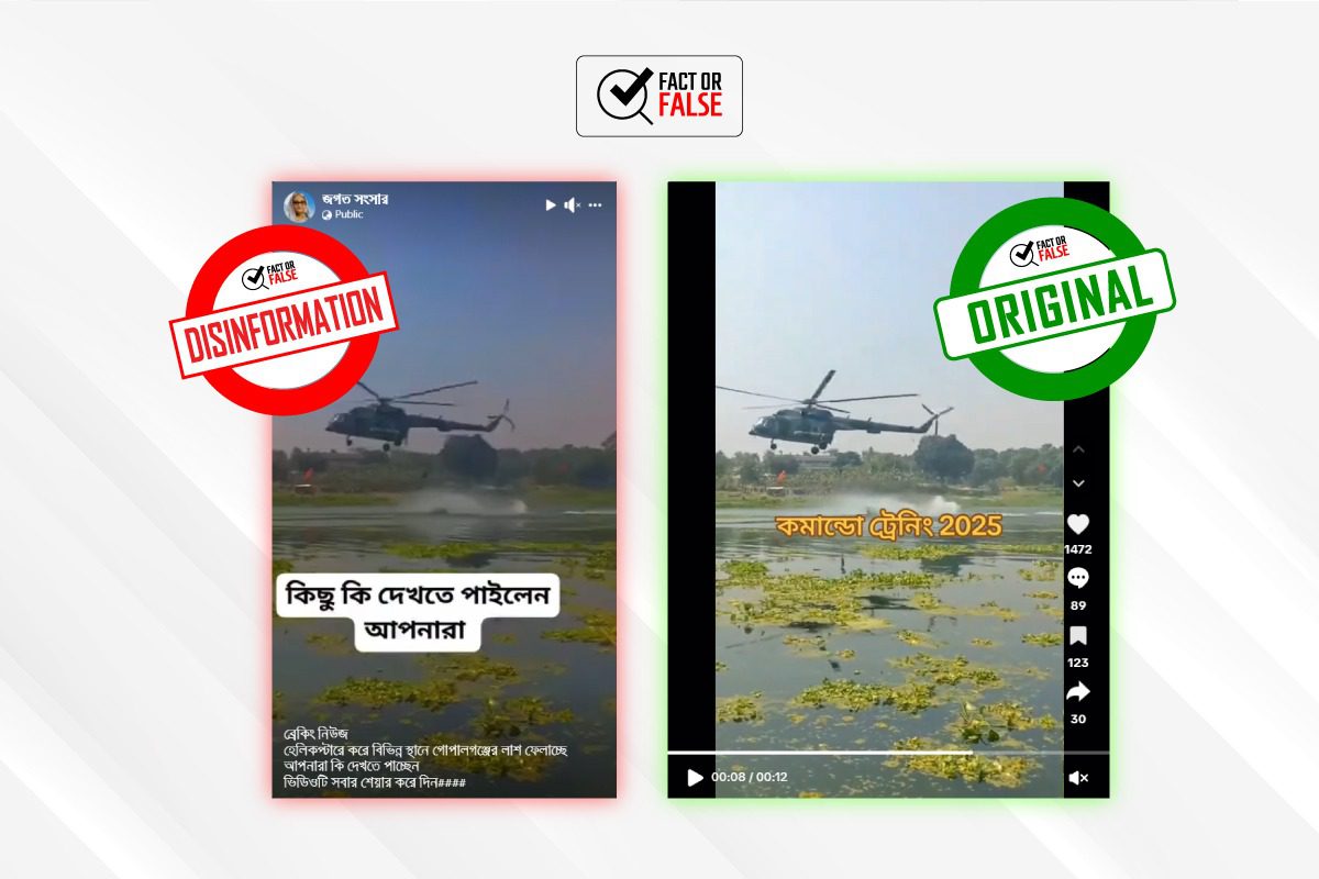 ছড়িয়ে পড়া একটি ভিডিওতে দেখা যায়, হেলিকপ্টার থেকে নদী বা খালের পানিতে কিছু ফেলা হচ্ছে। এই ভিডিওটি প্রচার করে দাবি করা হচ্ছে, “হেলিকপ্টার থেকে গোপালগঞ্জে লাশ ফেলা হচ্ছে”। তবে যাচাইয়ে দেখা যায়, ভিডিওটি সামরিক বাহিনীর প্রশিক্ষণের দৃশ্য, যা গত ফেব্রুয়ারিতে টিকটকে প্রকাশিত হয়।