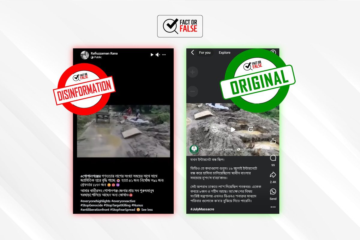 একটি ভাইরাল ভিডিওতে দেখা যায়, কয়েকজন ব্যক্তি গণকবর খুঁড়ছেন। এটি প্রচার করে দাবি করা হচ্ছে, “গোপালগঞ্জের গণহত্যার লাশের সংখ্যা সময়ের সাথে সাথে জ্যামিতিক হারে বৃদ্ধি পাচ্ছে, হত্যা ৫১ জন! নিখোঁজ ৩৯১ জন!” যাচাইয়ে দেখা যায়,ভিডিওটি মার্চে ফেসবুকে পোস্ট হয় এবং এতে রায়েরবাজার বধ্যভূমিতে মরদেহ দাফনের প্রসঙ্গ উঠে আসে। এটি ২০২৪ সালের জুলাই–অভ্যুত্থানকালীন সময়ের বলে জানা যায়।