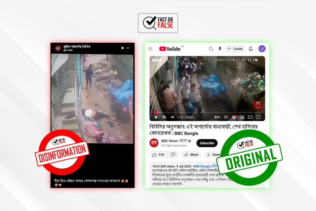 “ধীরে ধীরে বেরিয়ে আসছে গোপালগঞ্জ গণহত্যার লাশ”—এই দাবিতে একটি ভিডিও প্রচার করা হয়েছে। যাচাইয়ে দেখা গেছে, এটি গোপালগঞ্জের নয়, বরং ২০২৪ সালের ৫ আগস্ট ঢাকার যাত্রাবাড়ীতে ছাত্র জনতার আন্দোলনের সময়ের সিসিটিভি ফুটেজ। এই ভিডিও বিবিসি বাংলার ৯ জুলাই প্রকাশিত প্রতিবেদন ও প্রথম আলোর ১৪ জানুয়ারির একটি প্রামাণ্যচিত্রে দেখা ফুটেজের সঙ্গে মিলে যায়।