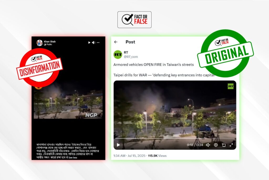 “হাসনাত সারজিস গংদের ট্যাংকের ভিতরে নিয়ে গোপালগঞ্জ থেকে বের হচ্ছে গুলি করতে করতে” শিরোনামে একটি ভিডিও সামাজিক মাধ্যমে ছড়ানো হয়েছে। যেখানে দাবি করা হয়েছে, এনসিপির নেতাদের ট্যাংকে করে গোপালগঞ্জ থেকে সরিয়ে নেওয়ার সময় সেনাবাহিনী গুলি ছুড়তে ছুড়তে তাদের নিয়ে গেছে। যাচাইয়ে দেখা গেছে, ভিডিওটি গোপালগঞ্জের নয়। এটি তাইওয়ানের বার্ষিক সামরিক মহড়া ‘হান কুয়াং ৪১’-এর একটি দৃশ্য, যা রাশিয়া-ভিত্তিক সংবাদমাধ্যম RT-এর এক্স হ্যান্ডেলে ১৫ জুলাই প্রকাশিত হয়েছিল।