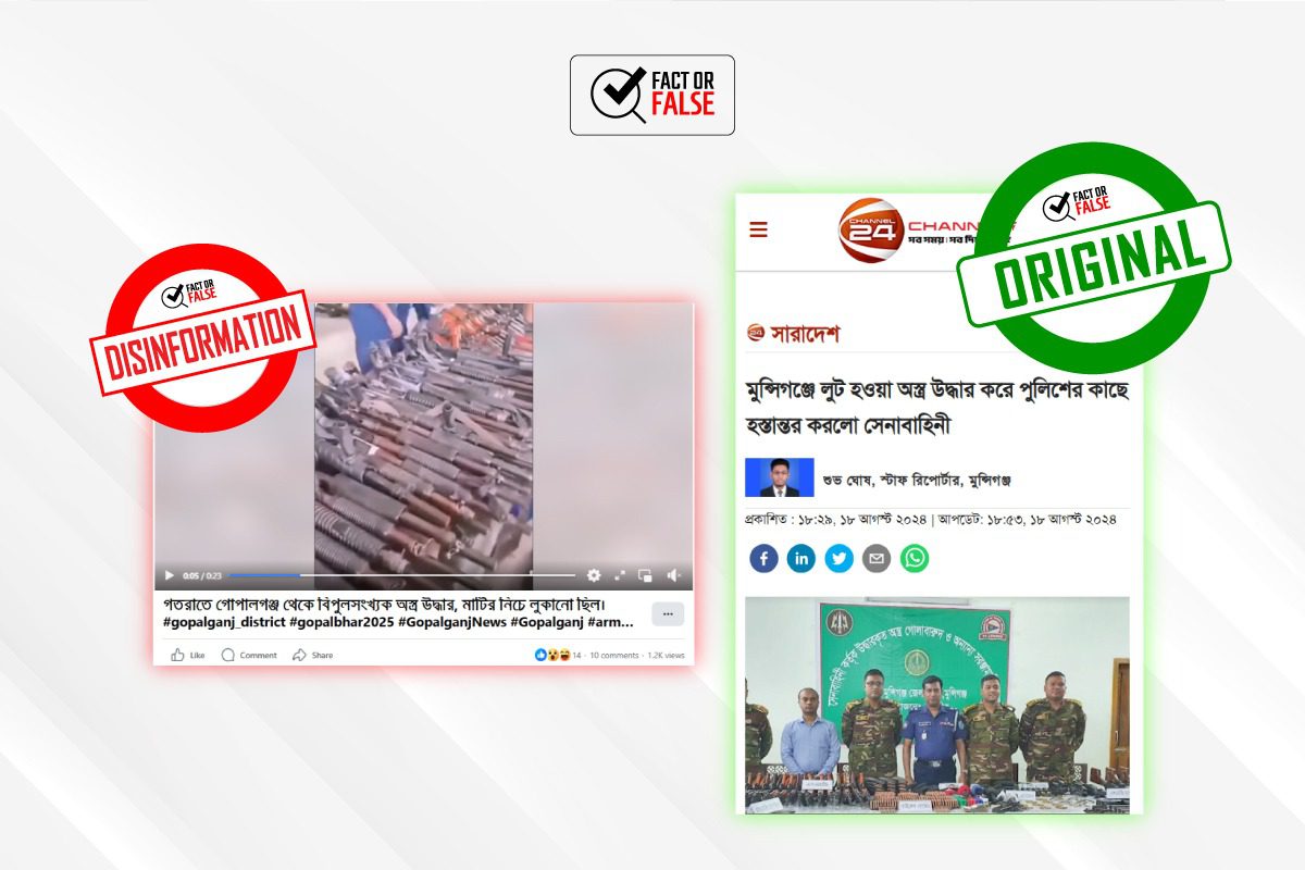 অস্ত্র উদ্ধারের একটি ভিডিও প্রচার করে দাবি করা হচ্ছে-“গোপালগঞ্জে মাটির নিচে লুকানো বিপুলসংখ্যক অস্ত্র উদ্ধার করা হয়েছে।”তবে যাচাইয়ে দেখা গেছে, ভিডিওটি গোপালগঞ্জের নয় এবং সাম্প্রতিকও নয়। এটি ২০২৪ সালের ১৮ আগস্ট মুন্সিগঞ্জের টঙ্গীবাড়ী থানায় লুট হওয়া অস্ত্র সেনাবাহিনী উদ্ধার করে পুলিশের কাছে হস্তান্তরের দৃশ্য। ভিডিওটি প্রথম ইনকিলাবের স্থানীয় সাংবাদিক শওকত হোসেনের ফেসবুকে প্রকাশিত হয়। ওই ঘটনায় সেনাবাহিনী ১৪০টি আগ্নেয়াস্ত্র, প্রায় ৪ হাজার রাউন্ড গুলি, নগদ অর্থ ও পুলিশের পোশাকসহ বিভিন্ন সরঞ্জাম উদ্ধার করে—যা একাধিক জাতীয় গণমাধ্যমে প্রকাশিত হয়।