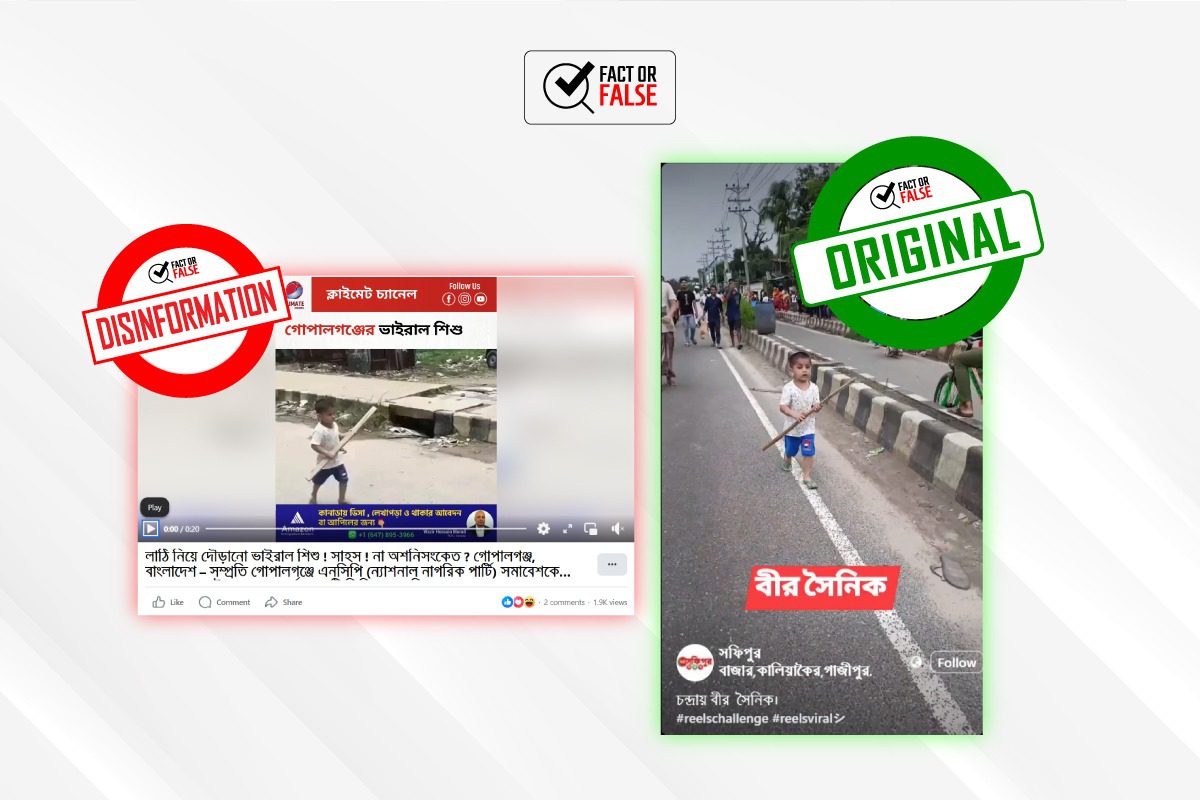লাঠি হাতে একটি শিশুর ছবি বা শর্টস ভিডিও প্রচার করে দাবি করা হয়েছে ছবিটি সাম্প্রতিক সময়ে গোপালগঞ্জে ধারণ করা। যাচাইয়ে দেখা গেছে, ছবিটি গোপালগঞ্জের নয় এবং সাম্প্রতিকও নয়। ছবিটি ২০২৪ সালের আগস্টে গাজীপুরের সফিপুর এলাকায় ধারণ করা একটি ভিডিওর স্ক্রিনশট। ওই ভিডিওতে শিশুটির পোশাক ও পরিবেশ ভাইরাল ছবির সঙ্গে হুবহু মিলে যায়। গুগল স্ট্রিটভিউ বিশ্লেষণে সেটি বাংলাদেশ আনসার ও ভিডিপি একাডেমির পাশের এলাকা হিসেবে শনাক্ত করা গেছে।
