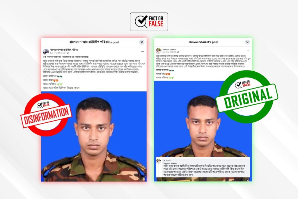 সামাজিক মাধ্যমে দাবি করা হয়েছে, ‘শোভন’ নামের এক সৈনিক ১৬ জুলাই গোপালগঞ্জ সহিংসতার প্রতিবাদে চাকরি ছেড়ে দিয়েছেন। তবে যাচাইয়ে দেখা গেছে, শোভন সৈকত নামের ওই ব্যক্তি গোপালগঞ্জের ঘটনার ছয় দিন আগে, অর্থাৎ ১০ জুলাই, ব্যক্তিগত কারণে সেনাবাহিনী থেকে পদত্যাগ করেন—যা তিনি নিজেই ফেসবুক পোস্টে উল্লেখ করেছেন। পরবর্তীতে ভাইরাল দাবি খণ্ডন করে তিনি জানান, “আমি গোপালগঞ্জের ঘটনার অনেক আগেই রিজাইন দিয়েছি, দয়া করে গুজবে কান দেবেন না।”