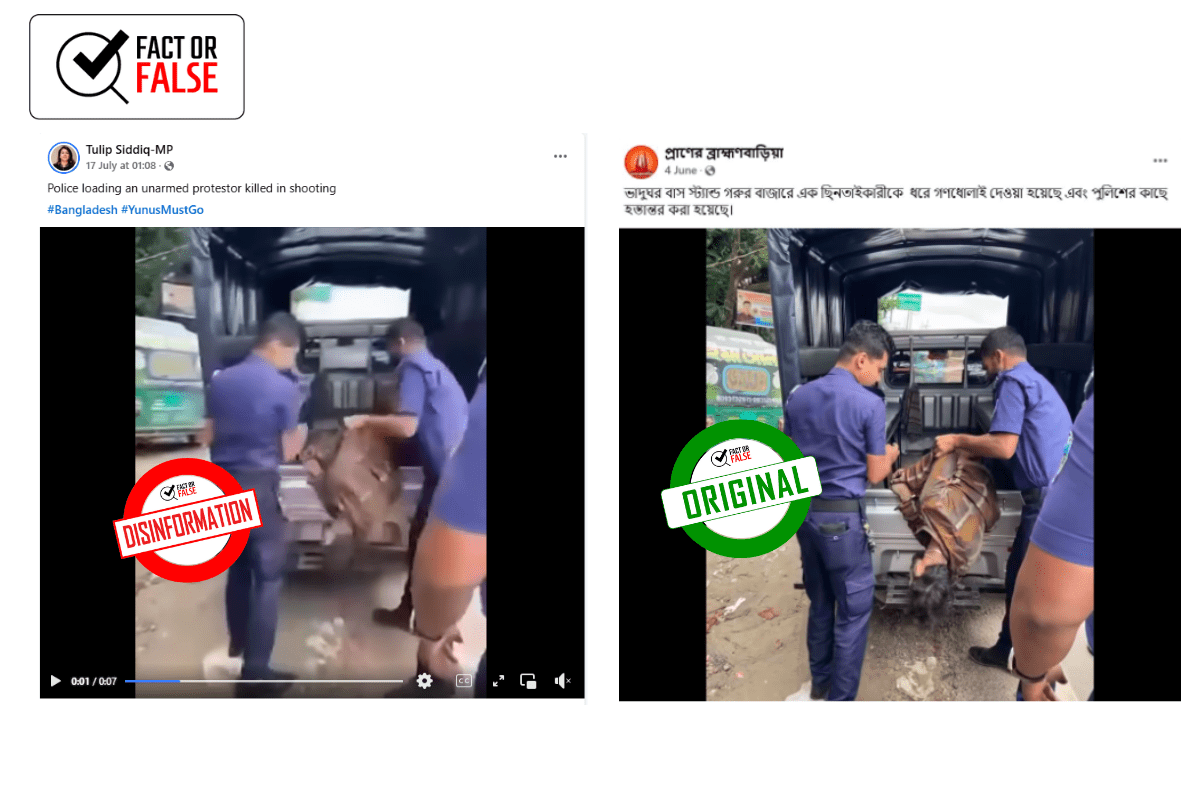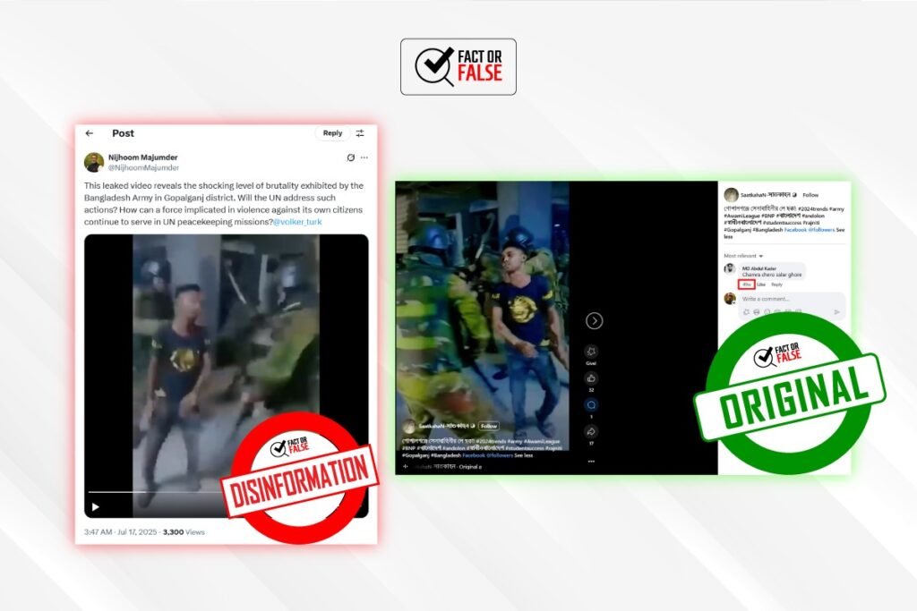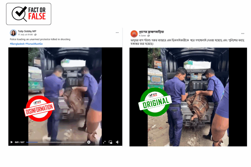 ইউটিবে প্রচারিত একটি ভিডিওতে দেখা যাচ্ছে, প্রায় অচেতন এক যুবককে পুলিশ ভ্যানে তোলা হচ্ছে। এই ভিডিওটি বিভিন্ন ইউটিউব চ্যানেল ও ফেসবুক একাউন্ট থেকে শেয়ার করে বলা হচ্ছে, “বর্তমান গোপালগঞ্জের অবস্থা” কিংবা “পুলিশ গুলি করে নিরস্ত্র এক বিক্ষোভকারীকে মেরে গাড়িতে তুলছে।” তবে যাচাইয়ে দেখা গেছে, ভিডিওটি গোপালগঞ্জের কোনো ঘটনার নয়, এটি ব্রাহ্মণবাড়িয়ার একটি পুরোনো ঘটনার দৃশ্য। ছিনতাইকারী সন্দেহে ওই ব্যক্তিকে ব্রাহ্মণবাড়িয়ার ভাদুঘর বাজারে কোরবানির গরুর হাটে ধরে গণপিটুনি দেওয়া হয়। পরে পুলিশ এসে তাকে উদ্ধার করে ভ্যানে তুলে নিয়ে যায়।