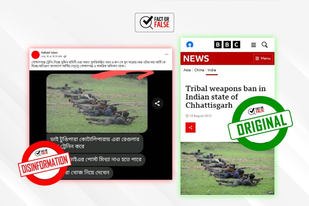 কয়েকজন অস্ত্রধারী ব্যক্তির প্রশিক্ষণরত ছবি শেয়ার করে ফেসবুকে দাবি করা হচ্ছে, এটি গোপালগঞ্জে ‘মুজিব বাহিনীর ট্রেনিং’-এর দৃশ্য। তবে রিভার্স ইমেজ সার্চে দেখা গেছে, ছবিটি বাংলাদেশের নয় এবং সাম্প্রতিকও নয়। ছবিটি ২০১২ সালের ৮ জুলাই ছত্তিশগড়ের বিজাপুরে মাওবাদীদের একটি ট্রেনিং ক্যাম্পে ধারণ করা হয়, যা AFP সূত্রে বিবিসি, ইন্ডিয়া ডট কম ও অন্যান্য ভারতীয় গণমাধ্যমে মাওবাদী বিষয়ক প্রতিবেদনে ফাইল ফটো হিসেবে ব্যবহৃত হয়েছে।