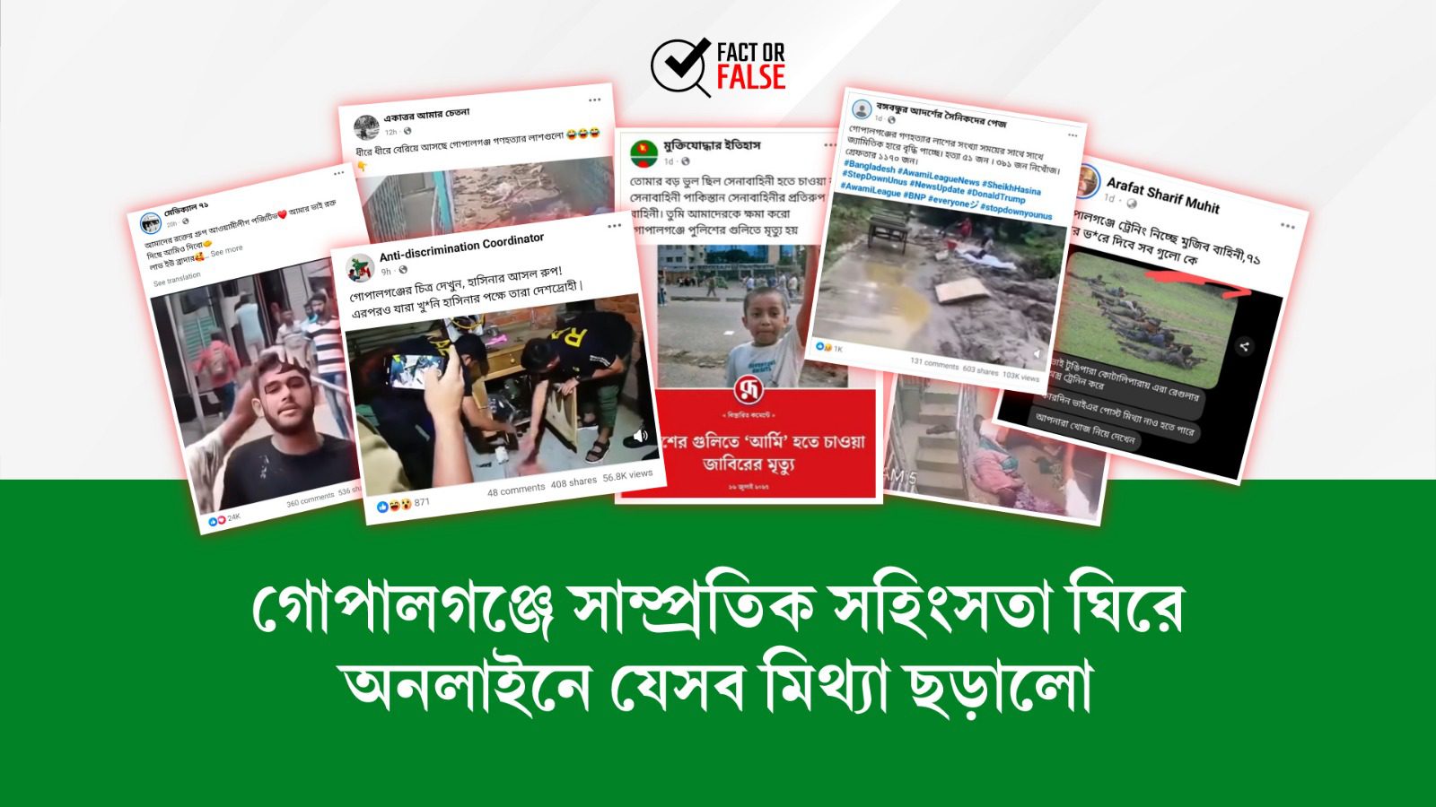 এমন পরিস্থিতিতে সামাজিক মাধ্যমে নানা গুজব ও বিভ্রান্তিকর প্রচারণা চালানো হচ্ছে। এই প্রতিবেদনে গোপালগঞ্জের সাম্প্রতিক সহিংসতা ঘিরে ছড়ানো বিভিন্ন ধরনের অপপ্রচার যেমন– মিথ্যা বক্তব্য, ভুয়া ফটোকার্ড এবং গুজবের সত্যতা যাচাই করা হয়েছে।