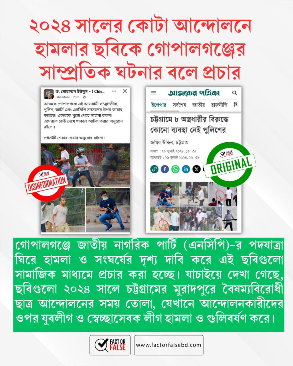 ২০২৪ সালের কোটা আন্দোলনে হামলার ছবিকে গোপালগঞ্জের সাম্প্রতিক ঘটনার বলে প্রচার করা হয়েছে। গোপালগঞ্জে জাতীয় নাগরিক পার্টি (এনসিপি)-র পদযাত্রা ঘিরে হামলা ও সংঘর্ষের দৃশ্য দাবি করে এই ছবিগুলো সামাজিক মাধ্যমে প্রচার করা হয়। যাচাইয়ে দেখা গেছে, ছবিগুলো ২০২৪ সালে চট্টগ্রামের মুরাদপুরে বৈষম্যবিরোধী ছাত্র আন্দোলনের সময় তোলা, যেখানে আন্দোলনকারীদের ওপর যুবলীগ ও স্বেচ্ছাসেবক লীগ হামলা ও গুলিবর্ষণ করে।