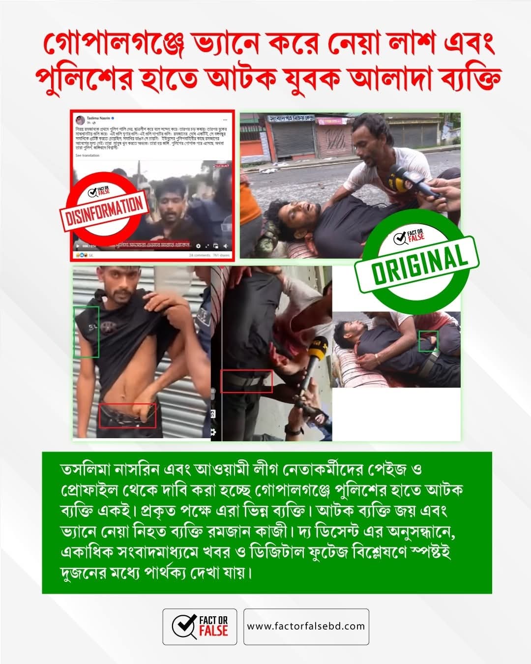 তসলিমা নাসরিন এবং আওয়ামীলীগ নেতাকর্মীদের পেইজ ও প্রোফাইল থেকে দাবি করা হয়, গোপালগঞ্জে ভ্যানে করে নেয়া লাশ এবং পুলিশের হাতে আটক ব্যক্তি একই। প্রকৃতপক্ষে এরা ভিন্ন ব্যক্তি। আটক ব্যক্তি জয় এবং ভ্যানে নেয়া নিহত ব্যক্তির নাম রমজান কাজী। দ্য ডিসেন্টের অনুসন্ধানে, একাধিক সংবাদমাধ্যমের খবর ও ডিজিটাল ফুটেজ বিশ্লেষণে স্পষ্টই দুজনের মধ্যে পার্থক্য দেখা যায়।