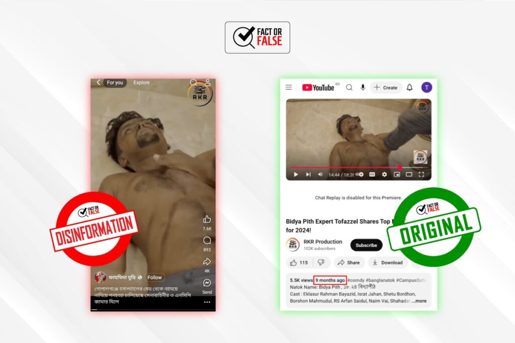 “গোপালগঞ্জে হাসপাতালের বেড থেকে নামিয়ে সেনাবাহিনী ও এনসিপি-জামাত মিলে গণহত্যা চালিয়েছে।” ফেসবুকে এই দাবি সম্বলিত একাধিক পোস্ট ছড়ানো হয়েছে। তবে যাচাইয়ে দেখা যায়, এটি ‘বিদ্যাপীঠ’ নামক একটি নাটকের দৃশ্য, যা ‘RKR Production’ নামের ইউটিউব চ্যানেলে ২০২৪ সালের ২৭ সেপ্টেম্বর প্রকাশিত হয়। নাটকটির ১৪ মিনিট ৪০ সেকেন্ডের সময় থেকে ভাইরাল ক্লিপের সঙ্গে মিল পাওয়া যায়। ‘বিদ্যাপীঠ’ নাটকটি তৈরি হয়েছে ঢাকা বিশ্ববিদ্যালয়ের ফজলুল হক মুসলিম হলে মোবাইল চুরির অভিযোগে মারধরের শিকার তোফাজ্জল নামের এক যুবকের মৃত্যুকে কেন্দ্র করে। ২০২৪ সালের ১৮ সেপ্টেম্বর ঘটে যাওয়া সেই আলোচিত ঘটনার ওপর ভিত্তি করেই নাটকটি নির্মিত।