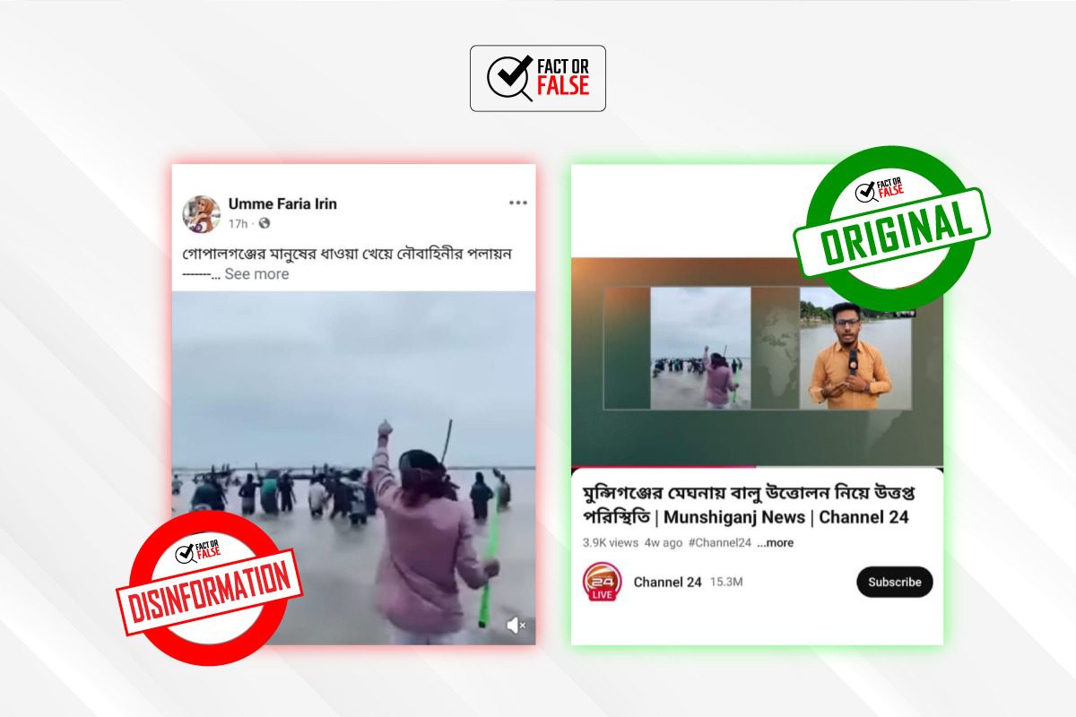 “গোপালগঞ্জের মানুষের ধাওয়া খেয়ে নৌবাহিনীর পলায়ন”—এই শিরোনামে আরেকটি ভিডিও সামাজিক মাধ্যমে প্রচার করা হয়েছে। তবে যাচেইয়ে গেছে,ভিডিওটি গোপালগঞ্জের নয়, বরং মুন্সিগঞ্জের মেঘনা নদীতে বালু উত্তোলন নিয়ে সংঘর্ষের পুরোনো ভিডিও। উক্ত ভিডিওর আসল উৎস চ্যানেল টোয়েন্টিফোর-এর ইউটিউব চ্যানেলে ২০২৪ সালের ১৯ জুন প্রকাশিত “মুন্সিগঞ্জের মেঘনায় বালু উত্তোলন নিয়ে উত্তপ্ত পরিস্থিতি” শিরোনামের একটি প্রতিবেদনে পাওয়া যায়। ওই ভিডিওর ১ মিনিট ১৩ সেকেন্ড থেকে ১ মিনিট ২৪ সেকেন্ড সময়ের ফুটেজের সঙ্গে ভাইরাল ক্লিপটির হুবহু মিল রয়েছে। ঘটনাটি ছিল—সরকারি ইজারাকৃত বালুমহালের নির্ধারিত সীমার বাইরে বালু উত্তোলন করায় স্থানীয়দের সঙ্গে শ্রমিকদের সংঘর্ষ। একই বিষয়ে যমুনা টিভির একটি প্রতিবেদন থেকেও একই ভিডিও ও তথ্য পাওয়া গেছে।
