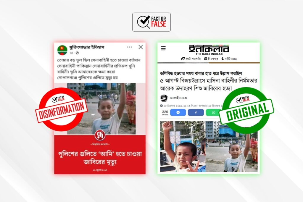 “পুলিশের গুলিতে আর্মি হতে চাওয়া জাবিরের মৃত্যু” দাবি করে সম্প্রতি একটি ফটোকার্ড ভাইরাল হয়েছে। তবে যাচাইয়ে দেখা গেছে, শিশু জাবির ইব্রাহিম সম্প্রতি নয়, গত বছর ৫ আগস্ট ঢাকার উত্তরায় আন্দোলনের সময় গুলিবিদ্ধ হয়ে মারা যায়। এ ঘটনায় তখন প্রথম আলো সহ একাধিক গণমাধ্যমে প্রতিবেদন প্রকাশ হয়। সুতরাং, তার মৃত্যু গোপালগঞ্জের সাম্প্রতিক ঘটনার সঙ্গে সম্পর্কিত নয়।