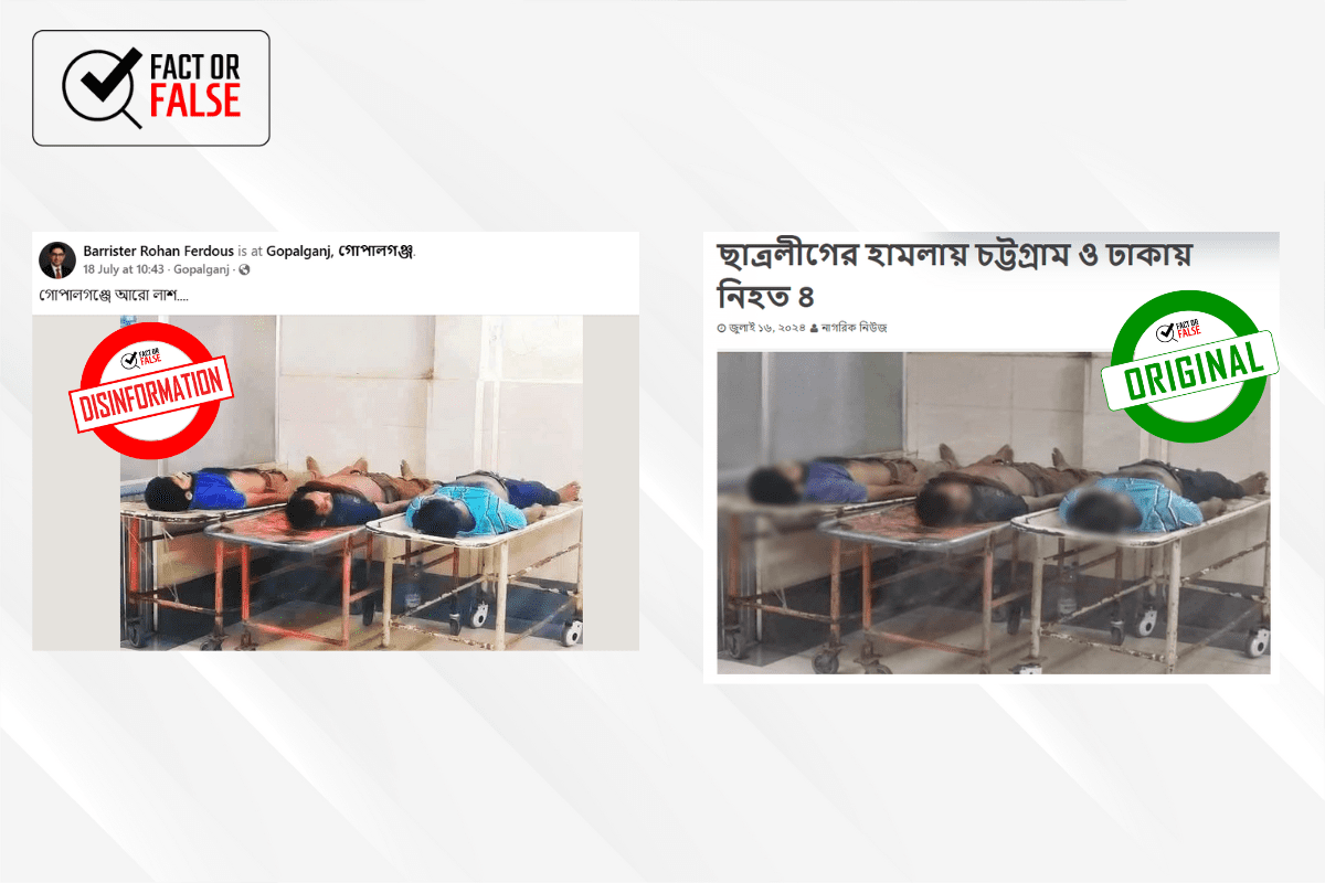 পাশাপাশি স্ট্রেচারে পড়ে থাকা নিথর তিন তরুণের একটি ছবি দিয়ে সামাজিক মাধ্যম ফেসবুকে দাবি করা হচ্ছে ‘গোপালগঞ্জে আরও লাশ’। তবে রিভার্স ইমেজ সার্চে দেখা গেছে, ছবিটি ২০২৪ সালের ১৬ জুলাই চট্টগ্রাম মেডিকেল কলেজ হাসপাতালে তোলা হয়েছিল। সে সময় কোটা সংস্কার আন্দোলনের মধ্যে চট্টগ্রামে ছাত্রলীগ ও যুবলীগের হামলায় এই তিন তরুণ নিহত হন। ছবিতে যাদের দেখা যাচ্ছে, তাঁদের একজন ছিলেন শহীদ ওয়াসিম আকরাম, যিনি চট্টগ্রামে কোটা আন্দোলনের প্রথম শহীদ হিসেবে পরিচিত। ছবিটি তখন বিএনপির ফেসবুক পেজ ও বিভিন্ন অনলাইন সংবাদমাধ্যমে প্রকাশিত হয়েছিল।