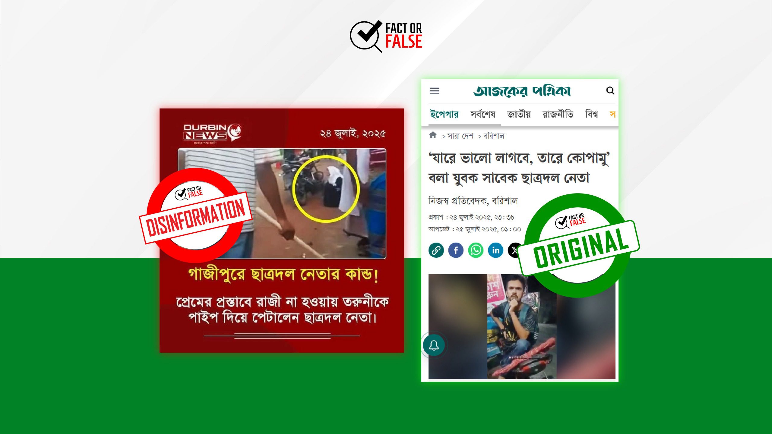সম্প্রতি ফেসবুকে দুরবীন নিউজ  নামের একটি পেজেগাজীপুরে ছাত্রদল নেতার কাণ্ড! প্রেমের প্রস্তাবে রাজি না হওয়ায় তরুণীকে পাইপ দিয়ে পেটালেন ছাত্রদল নেতাশিরোনামের একটি ফটোকার্ড প্রচার করা হয় সেখানে কালো বোরকা সাদা ওড়না পরিহিত এক তরুণীর ছবি ব্যবহার করা হলেও ঘটনার কোনো নির্ভরযোগ্য উৎস বা প্রমাণ উল্লেখ ছিল না।