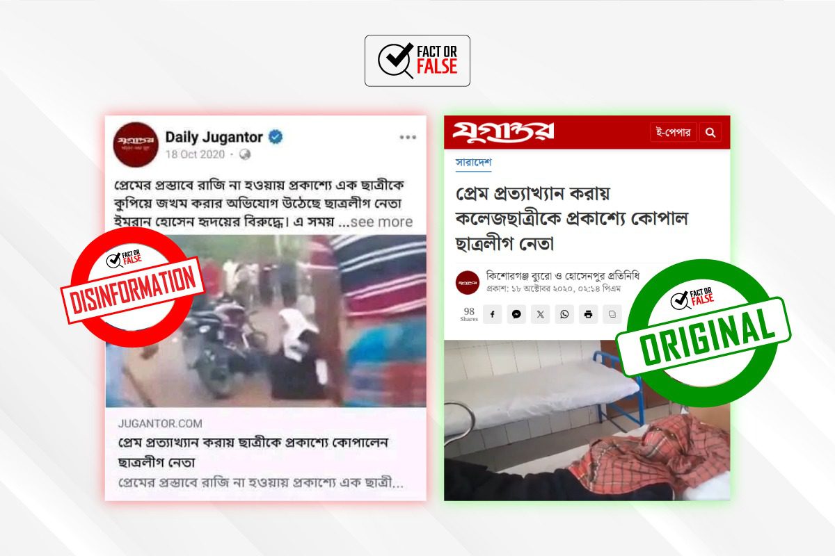 ভাইরাল এই ভিডিওর প্রসঙ্গে অনেকেই একটি পুরোনো সংবাদ টেনে এনে আরও বিভ্রান্তি ছড়ানোর চেষ্টা করেছেন। ২০২০ সালের ১৮ অক্টোবর তারিখে দৈনিক যুগান্তর পত্রিকায়প্রেম প্রত্যাখ্যান করায় কলেজছাত্রীকে প্রকাশ্যে কোপাল ছাত্রলীগ নেতাশিরোনামে একটি প্রতিবেদন প্রকাশিত হয়েছিল। কিন্তু বর্তমানে ভাইরাল হওয়া ভিডিওটির সঙ্গে সেই ঘটনার কোনো সম্পর্ক নেই। যাচাইয়ে দেখা গেছে, যুগান্তরের ওই পুরোনো খবরের স্ক্রিনশট এডিট করে তার সঙ্গে বর্তমানে ভাইরাল হওয়া ভিডিওর একটি দৃশ্য থাম্বনেইলের মতো করে জুড়ে দেয়া হয়েছে এতে সাধারণ পাঠকের মনে বিভ্রান্তি সৃষ্টি হতে পারেযেন ভিডিওটিই ২০২০ সালের প্রেমঘটিত ঘটনার অংশ। বাস্তবে, ভাইরাল ভিডিওটি সম্পূর্ণ নতুন এবং বরিশালে জমিসংক্রান্ত বিরোধের ঘটনায় ধারণ করা। এর সঙ্গে ২০২০ সালের প্রেম প্রত্যাখ্যানজনিত ঘটনার কোনো যোগসূত্র নেই।