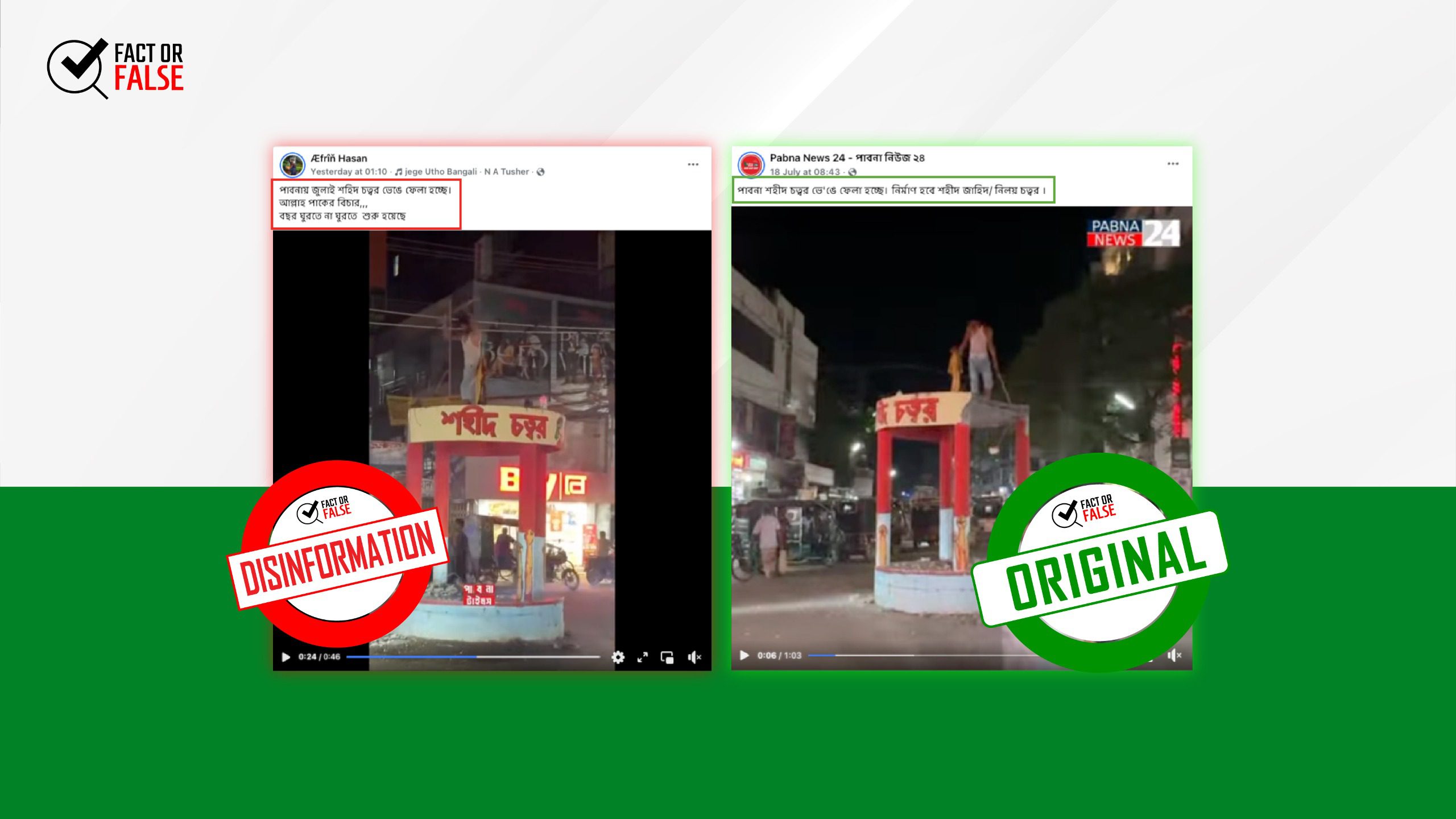 সম্প্রতি, সামাজিক মাধ্যম ফেসবুকে একটি ভিডিও প্রচার করে দাবি করা হয়েছে যে, “পাবনায় জুলাই শহিদ চত্বর ভেঙে ফেলা হচ্ছে। আল্লাহ পাকের বিচার, বছর ঘুরতে না ঘুরতেই শুরু হয়েছে।” ফেসবুকে এমন দাবিতে প্রচারিত কিছু ভিডিও দেখুন এখানে এখানে এখানে।
