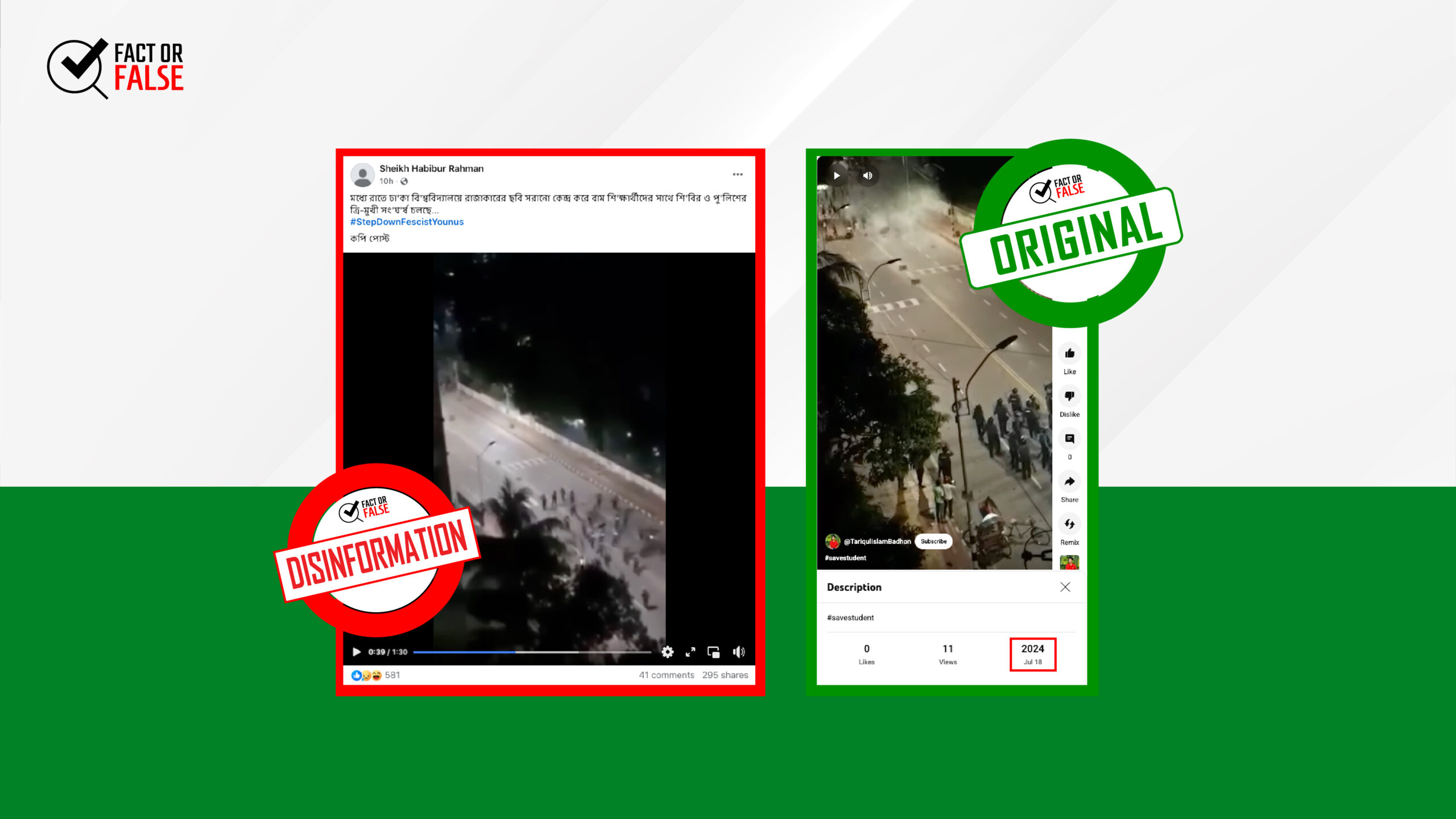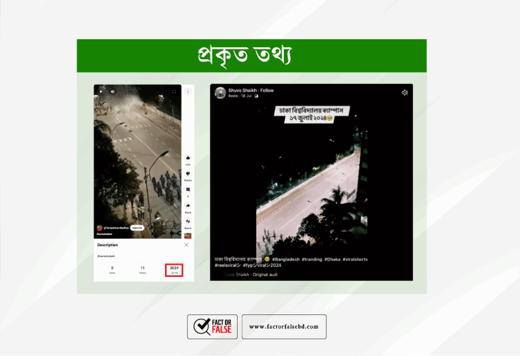 কিন্তু ফ্যাক্ট অর ফলস যাচাই করে দেখেছে যে প্রচারিত ভিডিওটি ২০২৫ সালের ৫ আগস্ট মধ্যরাতের নয়। বরং এটি একবছরের অধিক পুরোনো। ভিডিওর কিফ্রেম রিভার্স সার্চ করে দেখা গেছে যে এটি ২০২৪ সালের বৈষম্যবিরোধী ছাত্র আন্দোলনের ভিডিও। ১৭ জুলাই মধ্যরাতে অর্থাৎ ১৮ জুলাই ঢাকা বিশ্ববিদ্যালয়ের শেখ রাসেল টাওয়ারের সামনের সড়কে আন্দোলনকারী ছাত্রদের লক্ষ্য করে পুলিশ টিয়ারশেল নিক্ষেপ করছে। পার্শবর্তী একটি ভবন থেকে ভিডিওটি ধারণ করা হয়েছে।