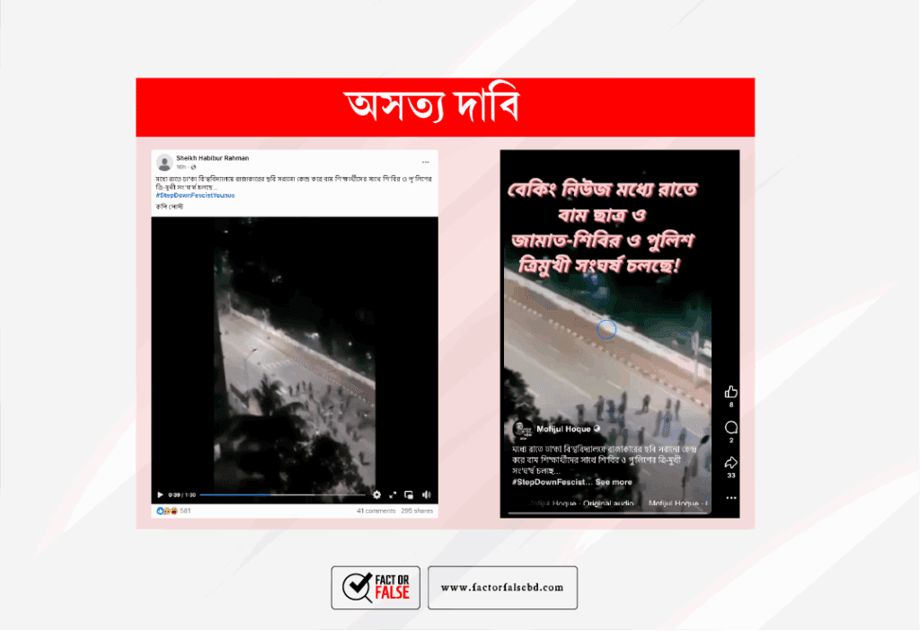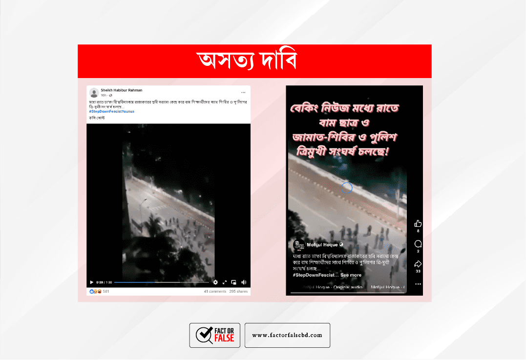 সম্প্রতি ঢাকা বিশ্ববিদ্যালয়ে মধ্যরাতে রাজাকারের ছবি সরানো কেন্দ্র করে বাম শিক্ষার্থীদের সাথে শিবির ও পুলিশের ত্রিমুখী সংঘর্ষ চলছে দাবি করে একটি ভিডিও প্রচারিত হচ্ছে। ভিডিওতে দেখা যায় ঢাকা বিশ্ববিদ্যালয়ের শেখ রাসেল টাওয়ারের পাশের রাস্তায় একদল পুলিশ অবস্থান করছে ও দূরে অপর একদল শিক্ষার্থীদের লক্ষ্য করে টিয়ার শেল নিক্ষেপ করছে। প্রচারিত দাবিগুলো দেখুন এখানে (আর্কাইভ), এখানে (আর্কাইভ)। রিপোর্টটি লেখার সময় পর্যন্ত ভিডিওটি ৫৫ হাজারের অধিকবার দেখা হয়েছে, ৬০০’র অধিক রিয়েকশন ও ৩০০’র অধিক শেয়ার করা হয়েছে।