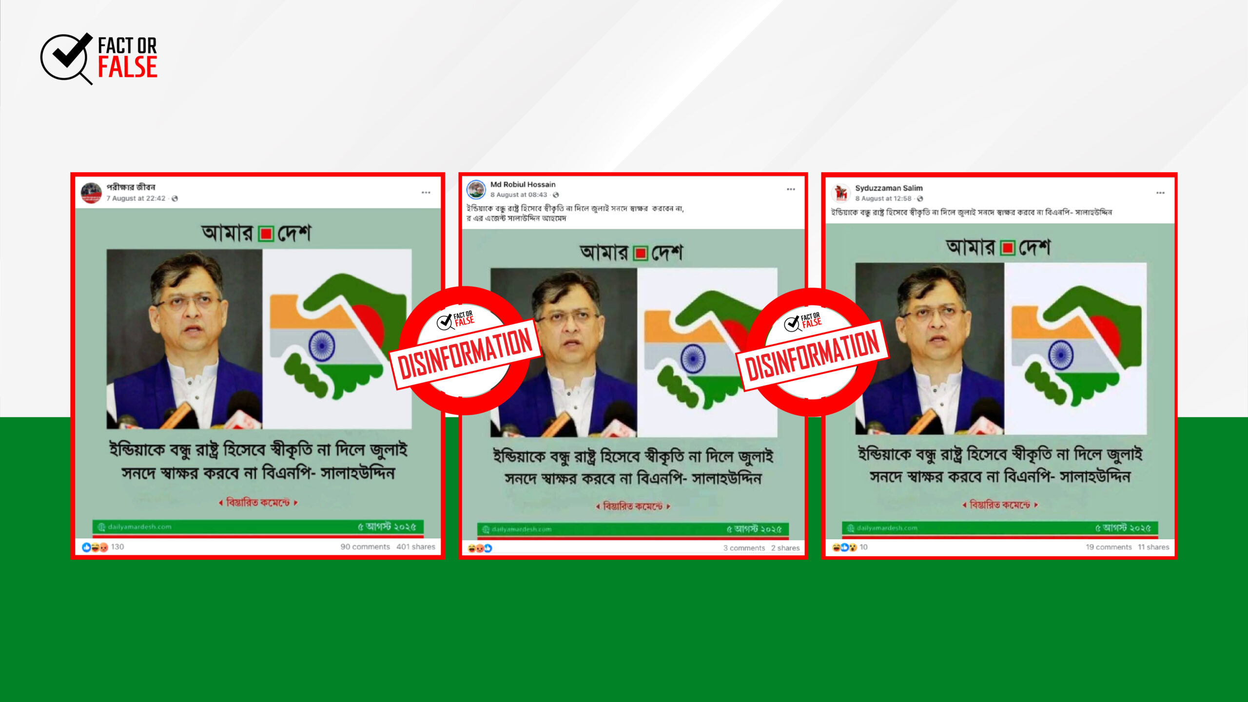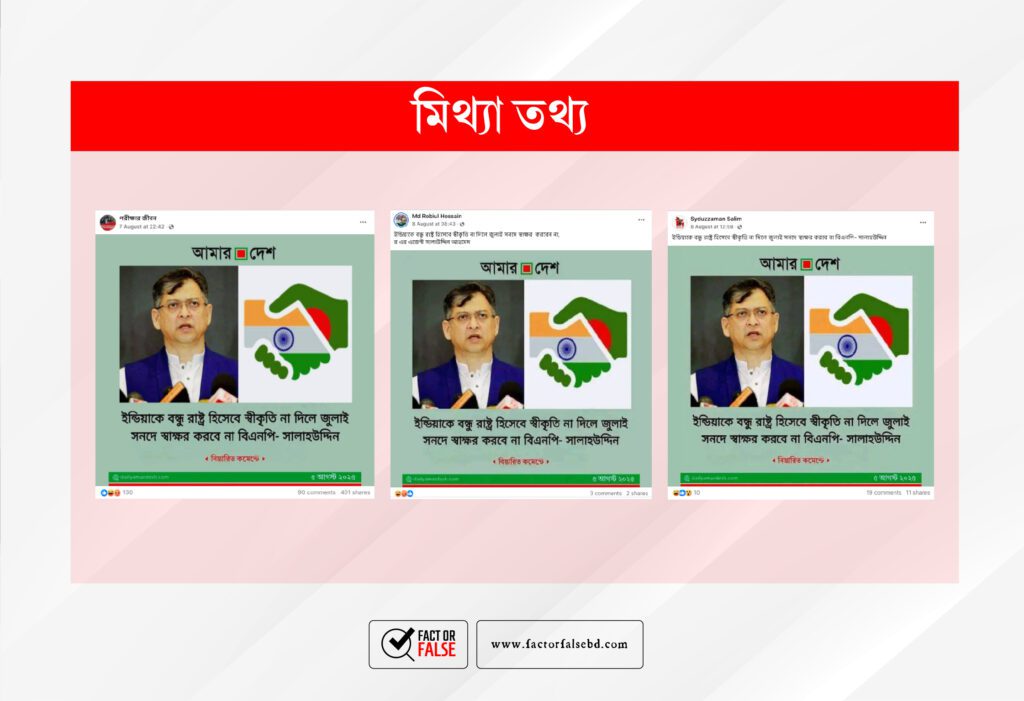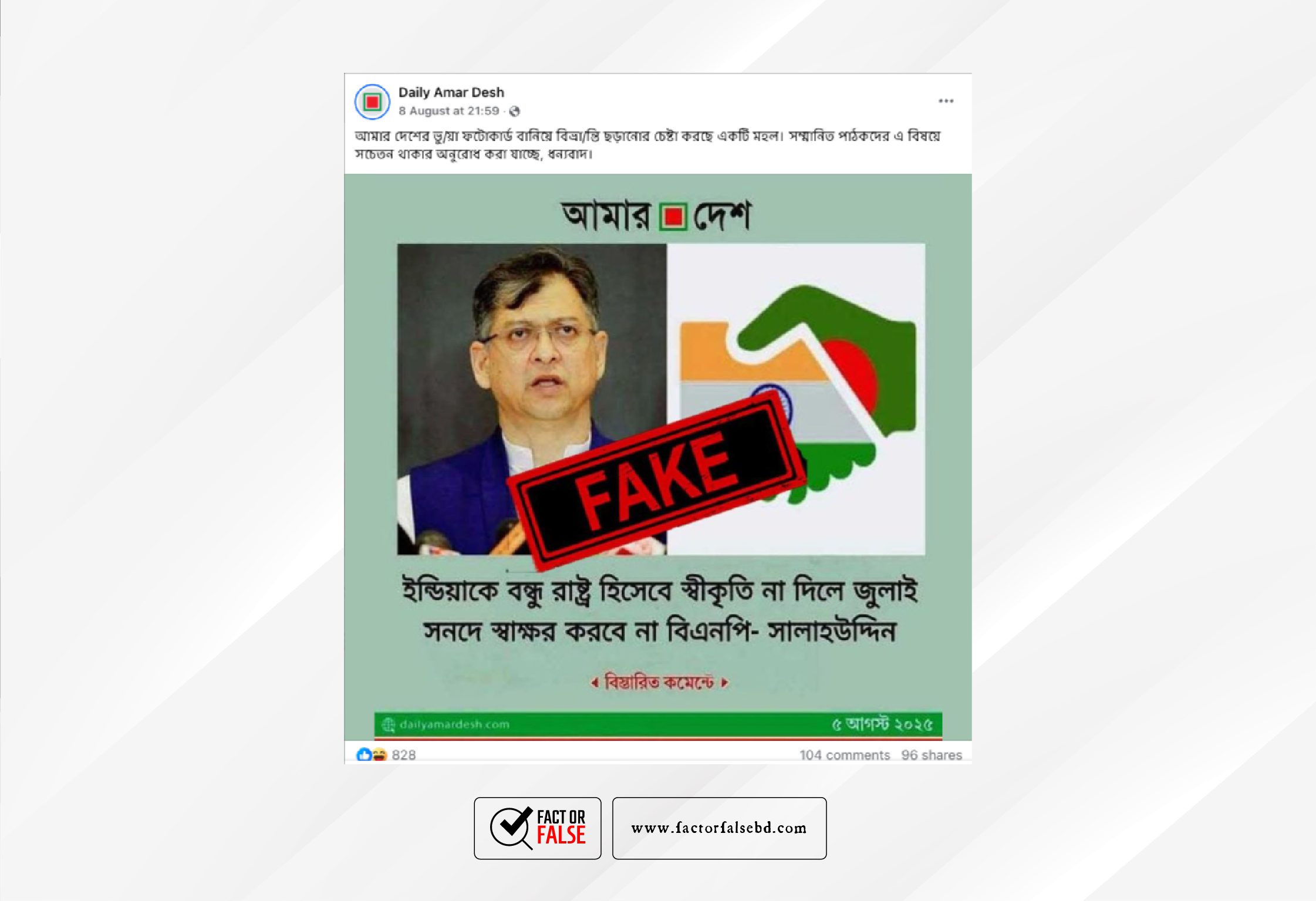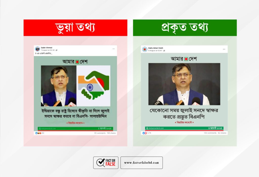 এছাড়া যাচাইয়ে দেখা যায়, ০৪ আগস্ট ২০২৫ তারিখেআমার দেশ’-এর ভেরিফায়েড ফেসবুক পেজেযেকোনো সময় জুলাই সনদে সই করতে প্রস্তুত বিএনপিশিরোনামে সালাহউদ্দিন আহমেদের ছবি সম্বলিত একটি ফটোকার্ড প্রকাশিত হয়। পর্যবেক্ষণে দেখা যায়, আলোচিত ভুয়া ফটোকার্ডটির ডিজাইন ব্যবহৃত ছবি মূল ফটোকার্ডটির সাথে মিল রয়েছে। তবে ভুয়া সংস্করণে বাংলাদেশের পতাকার পাশে ভারতের পতাকা সংযোজন করা হয়েছে এবং শিরোনাম পরিবর্তন করে লেখা হয়েছে-“ইন্ডিয়াকে বন্ধু রাষ্ট্র হিসেবে স্বীকৃতি না দিলে জুলাই সনদে স্বাক্ষর করবেন না বিএনপিসালাহউদ্দিন