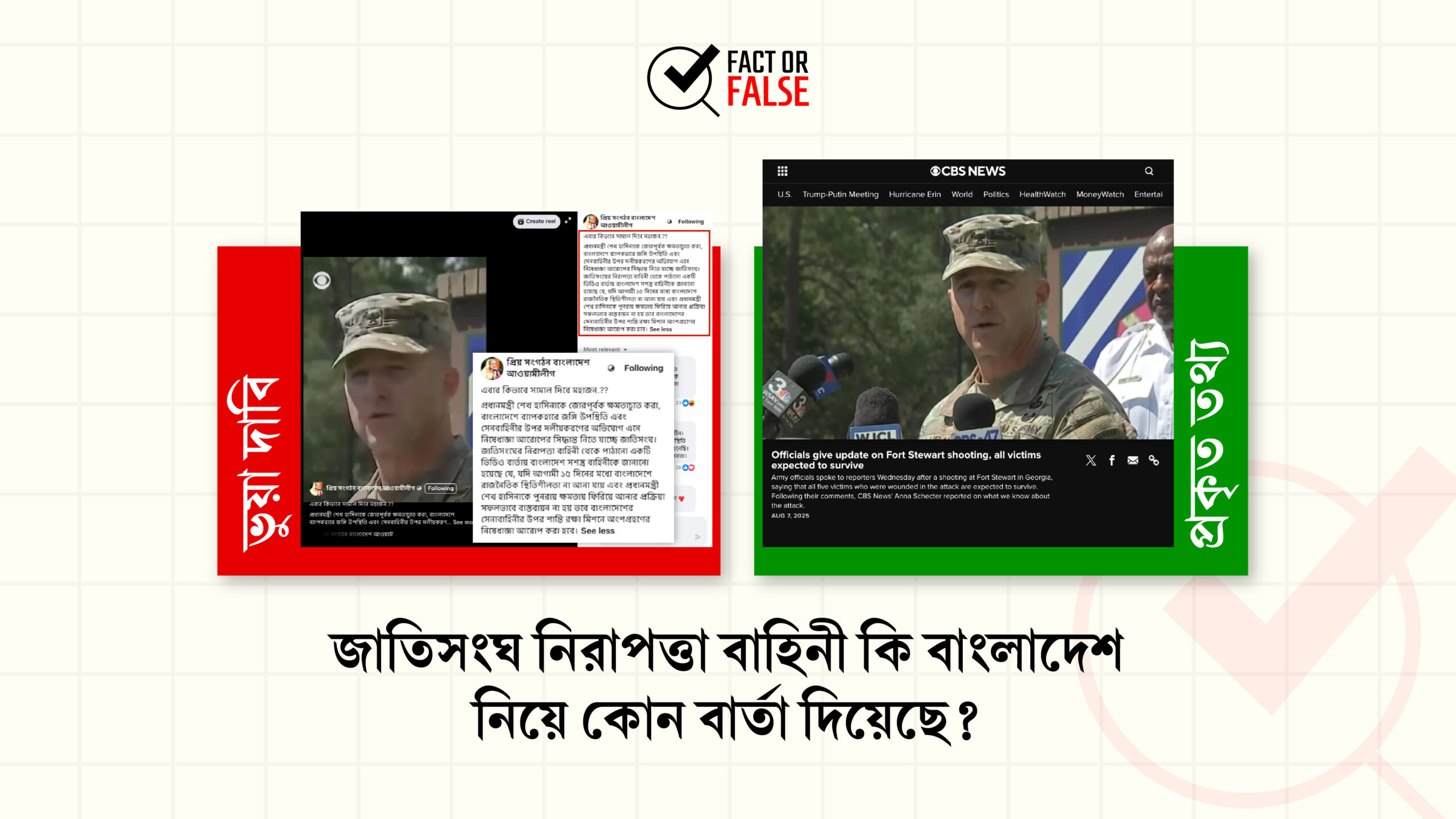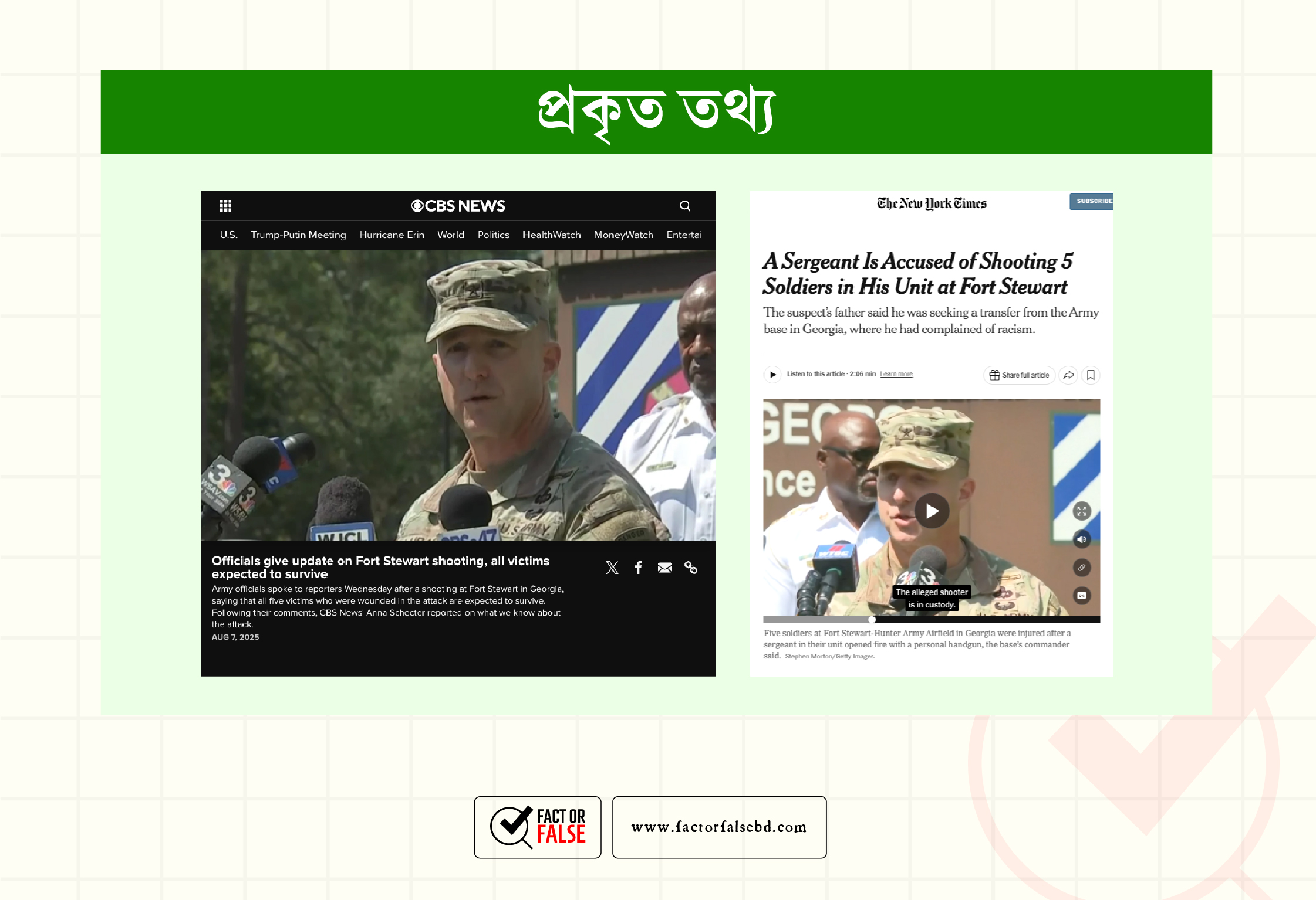 ভিডিওতে ইউএস আর্মির একজন অফিশিয়ালকে বিবৃতি দিতে দেখা যায়। ১ মিনিট ৩ সেকেন্ডের ভিডিওটির এক কোনায় CBS News এর লোগো দেখতে পাওয়া যায়। এছাড়া ভিডিওবার্তার কিওয়ার্ড ধরে খুঁজে ও ইমেজ রিভার্স সার্চ দিয়ে প্রকৃত ঘটনাটি খুঁজে পাওয়া যায়। ঘটনাটি মূলত ৭ আগস্ট ২০২৫ তারিখে জর্জিয়ার ফোর্ট স্টুয়ার্ট আর্মি এয়ারফিল্ডে এক সেনা কর্মকর্তা কর্তৃক সহকর্মীদের উপর গুলি চালনার ঘটনা পরবর্তী সাংবাদিক সম্মেলনের ভিডিও।