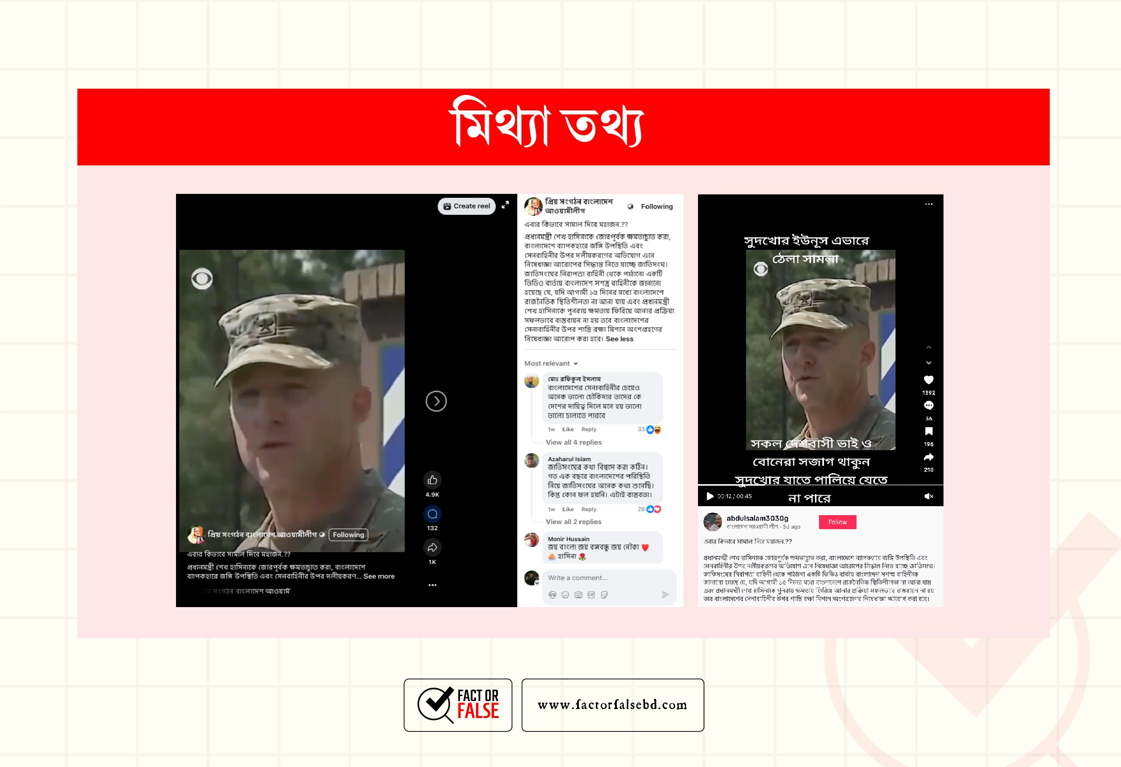 সম্প্রতি একটি ভিডিওকে বাংলাদেশ সশস্ত্র বাহিনীকে উদ্দেশ্য করে জাতিসংঘের নিরাপত্তা বাহিনী থেকে পাঠানো বার্তা দাবিতে সামাজিক মাধ্যমগুলোতে প্রচার করা হচ্ছে। ১ মিনিট ৩ সেকেন্ডের ভিডিওটিতে যুক্তরাষ্ট্র সেনাবাহিনীর একজন জনসংযোগ কর্মকর্তাকে কথা বলতে দেখা যায়। ভিডিওর ক্যাপশনে বলা হয় যে “এবার কিভাবে সামাল দিবে মহাজন.??” পোস্ট দেখুন এখানে (আর্কাইভ), এখানে (আর্কাইভ), এখানে (আর্কাইভ)।