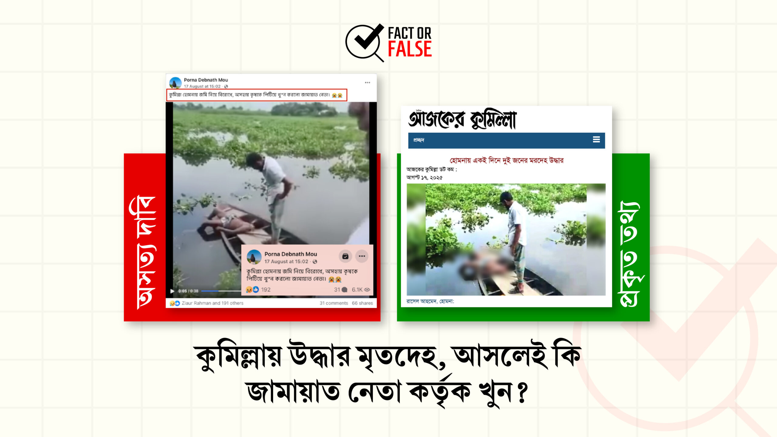 ফ্যাক্ট অর ফলস-এর যাচাইয়ে দেখা যায়, ১৭ আগস্ট ২০২৫ কুমিল্লা থেকে দুটি মরদেহ উদ্ধার করা হয়েছে যার একজন কবির হোসেন। কবির হোসেনের মরদেহ প্রচারিত ভিডিওতে নৌকায় পড়ে থাকতে দেখা যায়। কিন্তু তার মৃত্যুর সাথে জামায়াত নেতার কোনো সংশ্লিষ্টতার খবর পাওয়া যায়নি।