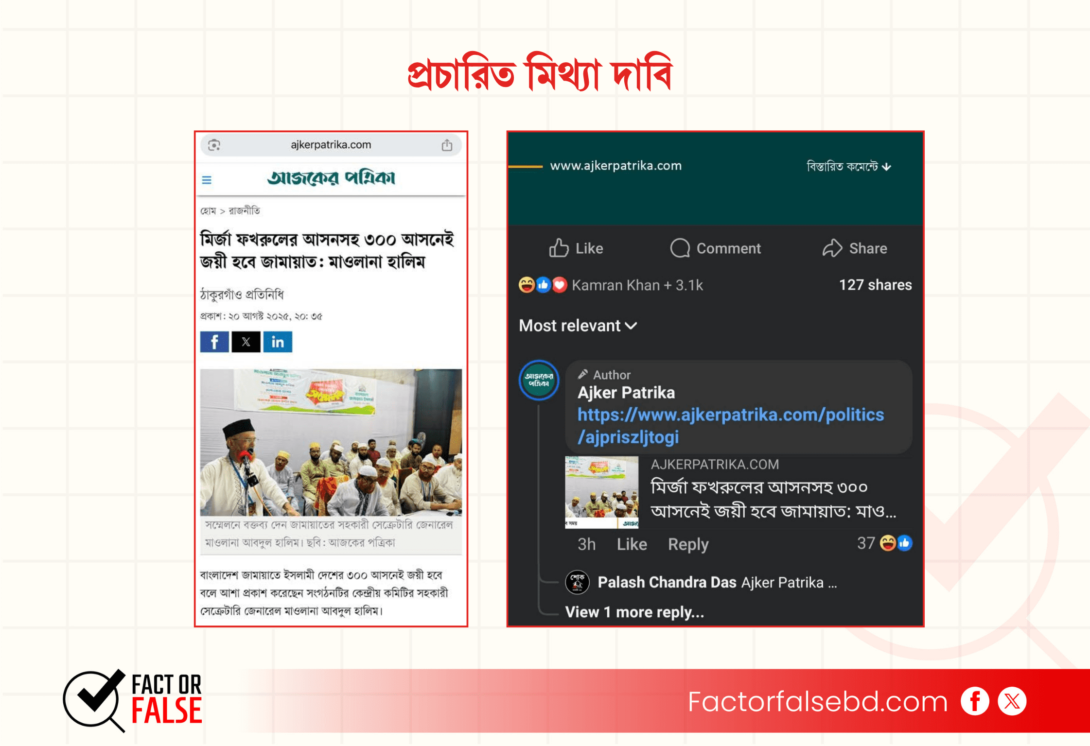 ২০ আগস্ট ২০২৫ তারিখে আজকের পত্রিকা একটি সংবাদ প্রকাশ করে যার শিরোনাম ছিল – “মির্জা ফখরুলের আসনসহ ৩০০ আসনেই জয়ী হবে জামায়াত: মাওলানা হালিম”। সংবাদটির ফটোকার্ডেও একই শিরোনাম ব্যবহার করা হয়। ফেসবুক পেইজে পোস্ট করা ফটোকার্ডের আর্কাইভ লিঙ্ক দেখুন এখানে। এই পোস্টের নিচে কমেন্টে দেয়া হয় খবরের লিংকটি।