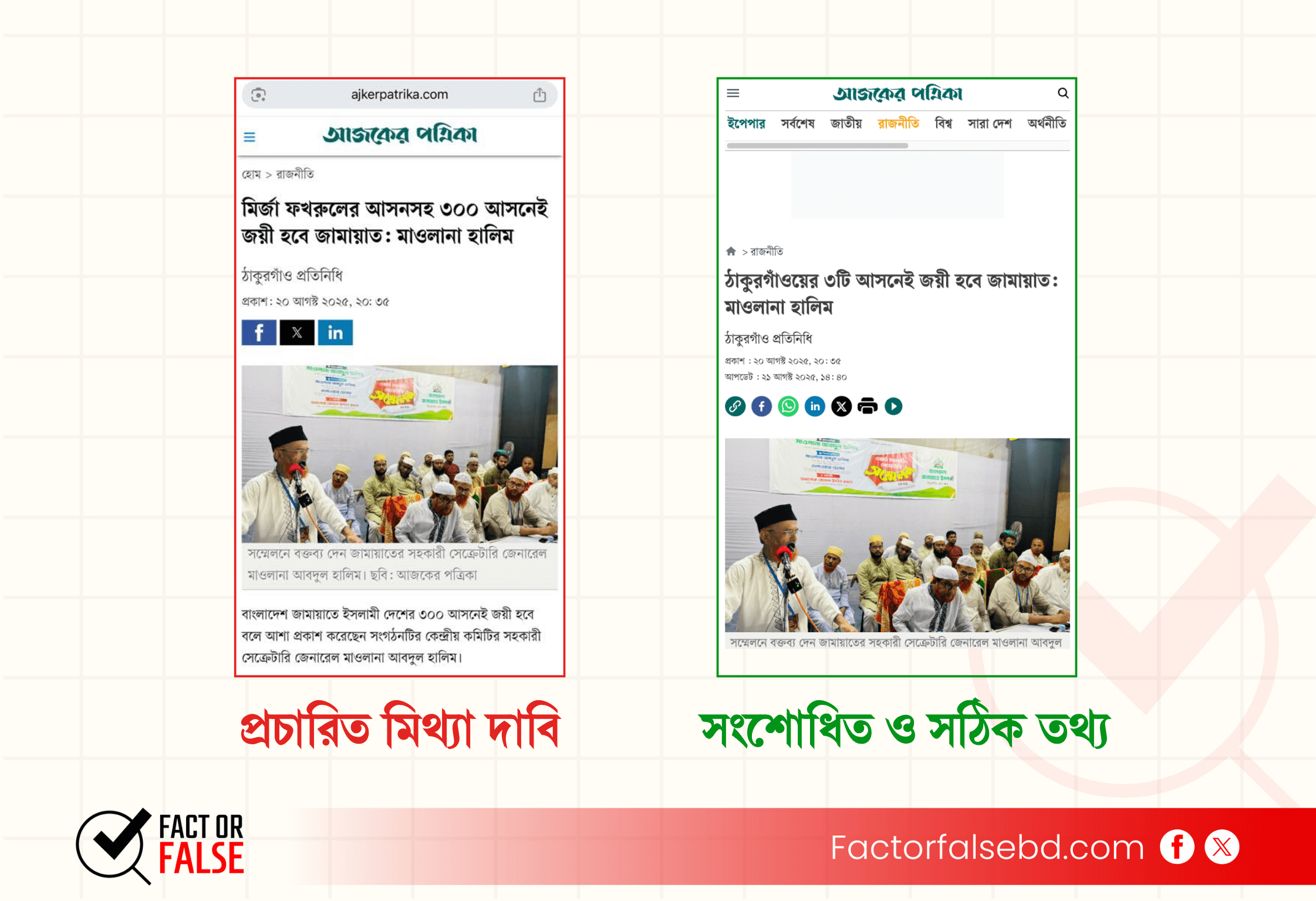 যাচাইয়ে দেখা গেছে, মাওলানা আবদুল হালিম ২০ আগস্ট (বুধবার) ঠাকুরগাঁও শহরের মির্জা রুহুল আমিন মিলনায়তনে জেলা জামায়াত আয়োজিত এক সম্মেলনে বক্তব্য দেন। তবে তিনি তার সেই বক্তব্যে বলেননি যে, জামায়াত সারাদেশের ৩০০ আসনে জয়ী হবে। তার বক্তব্য ছিল সীমিত ও নির্দিষ্ট; তিনি শুধু উল্লেখ করেছিলেন যে, ঠাকুরগাঁও–১ আসনসহ জেলার তিনটি আসনে জামায়াত জয়ী হবে। অর্থাৎ তার বক্তব্য স্থানীয় রাজনৈতিক প্রেক্ষাপটকে ঘিরেই ছিল। কিন্তু আজকের পত্রিকা সেটিকে বিকৃতভাবে উপস্থাপন করে দাবি করেছে, জামায়াত ৩০০ আসনেই জয়ী হবে।
