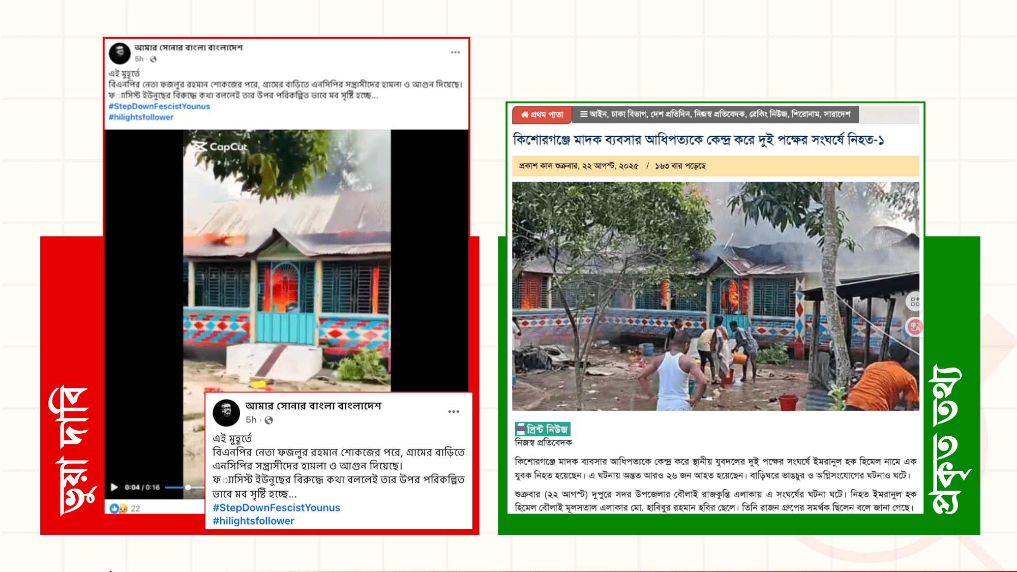 আরও যাচাইয়ে দেখা যায়, ২২ আগস্ট ২০২৫ তারিখে প্রথম আলো–তে প্রকাশিত একটি প্রতিবেদনে একই ঘটনার বর্ণনা পাওয়া যায়। ওই প্রতিবেদনে উল্লেখ করা হয়েছে, কিশোরগঞ্জ সদর উপজেলার বৌলাই পুরান বাজার এলাকায় যুবদলের দুই পক্ষের মধ্যে আধিপত্য বিস্তারকে কেন্দ্র করে সংঘর্ষ ও গুলির ঘটনা ঘটে। এতে হিমেল মিয়া নামের এক যুবক নিহত ও অন্তত ২০ জন আহত হন। ঘটনার পর প্রতিপক্ষের বাড়িঘরে ভাঙচুর ও অগ্নিসংযোগ হয়।