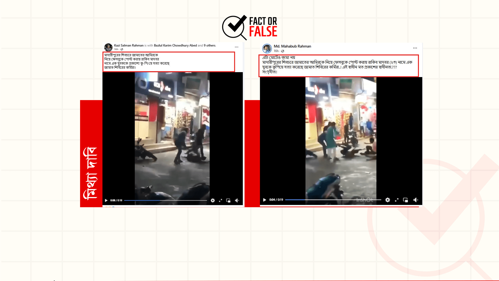 অর্থাৎ. “ফেসবুকে জামায়াত আমিরকে নিয়ে পোস্ট দেওয়ায় জামায়াত–শিবির কর্মীরা রাকিব মাদবরকে হত্যা করেছে”—এই দাবিটি সম্পূর্ণ মিথ্যা। মূলত পূর্বশত্রুতা ও আগের হত্যা মামলার বিরোধকে কেন্দ্র করে এই হত্যাকান্ড ঘটেছে।