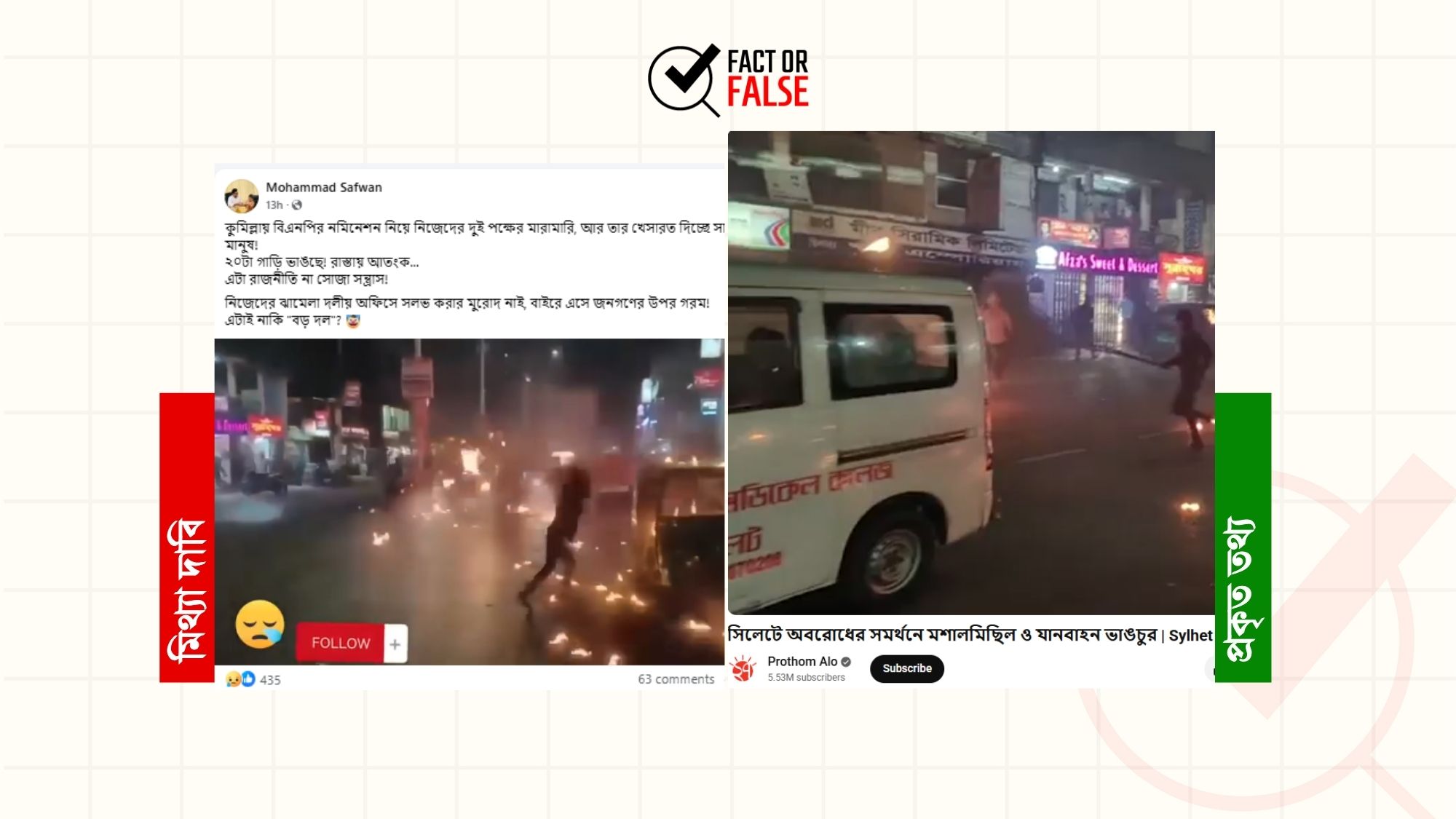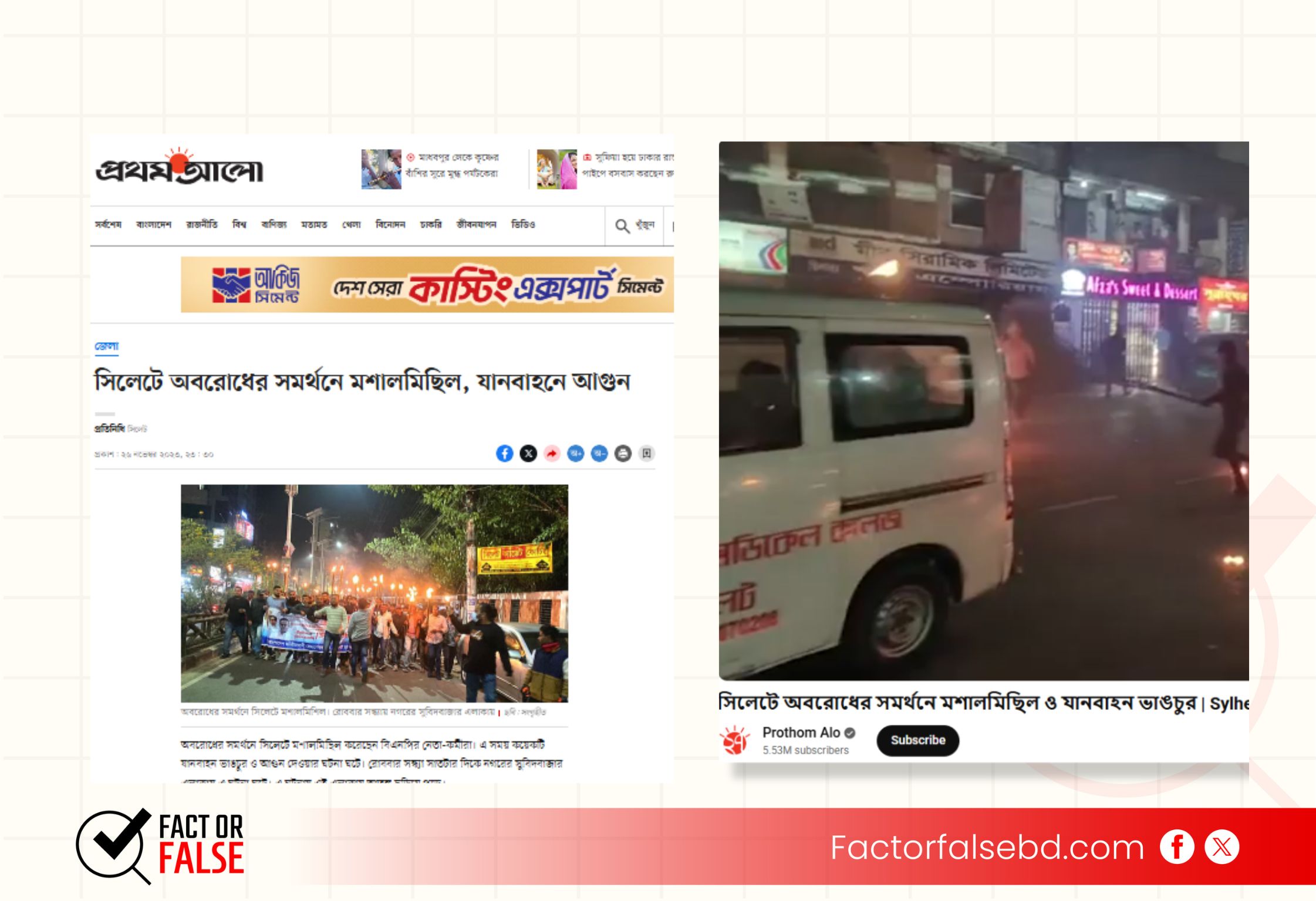 আলোচিত দাবিটির বিষয়ে অনুসন্ধানে রিভার্স ইমেজ সার্চ করলে প্রথম আলোর একটি ভিডিও প্রতিবেদন পাওয়া যায়।যেটার টাইটেল ছিলো, “সিলেটে অবরোধের সমর্থনে মশালমিছিল ও যানবাহন ভাঙচুর।”