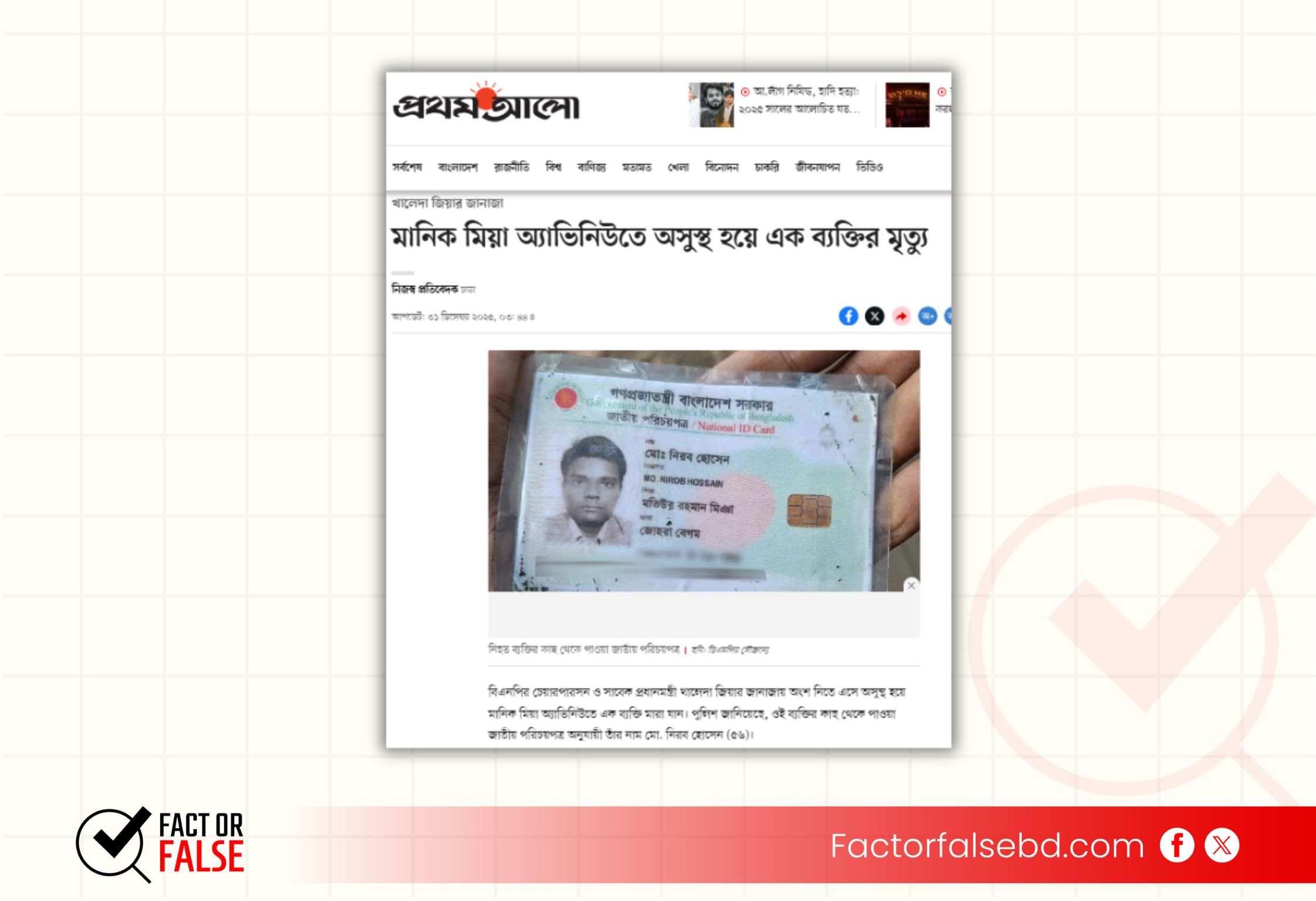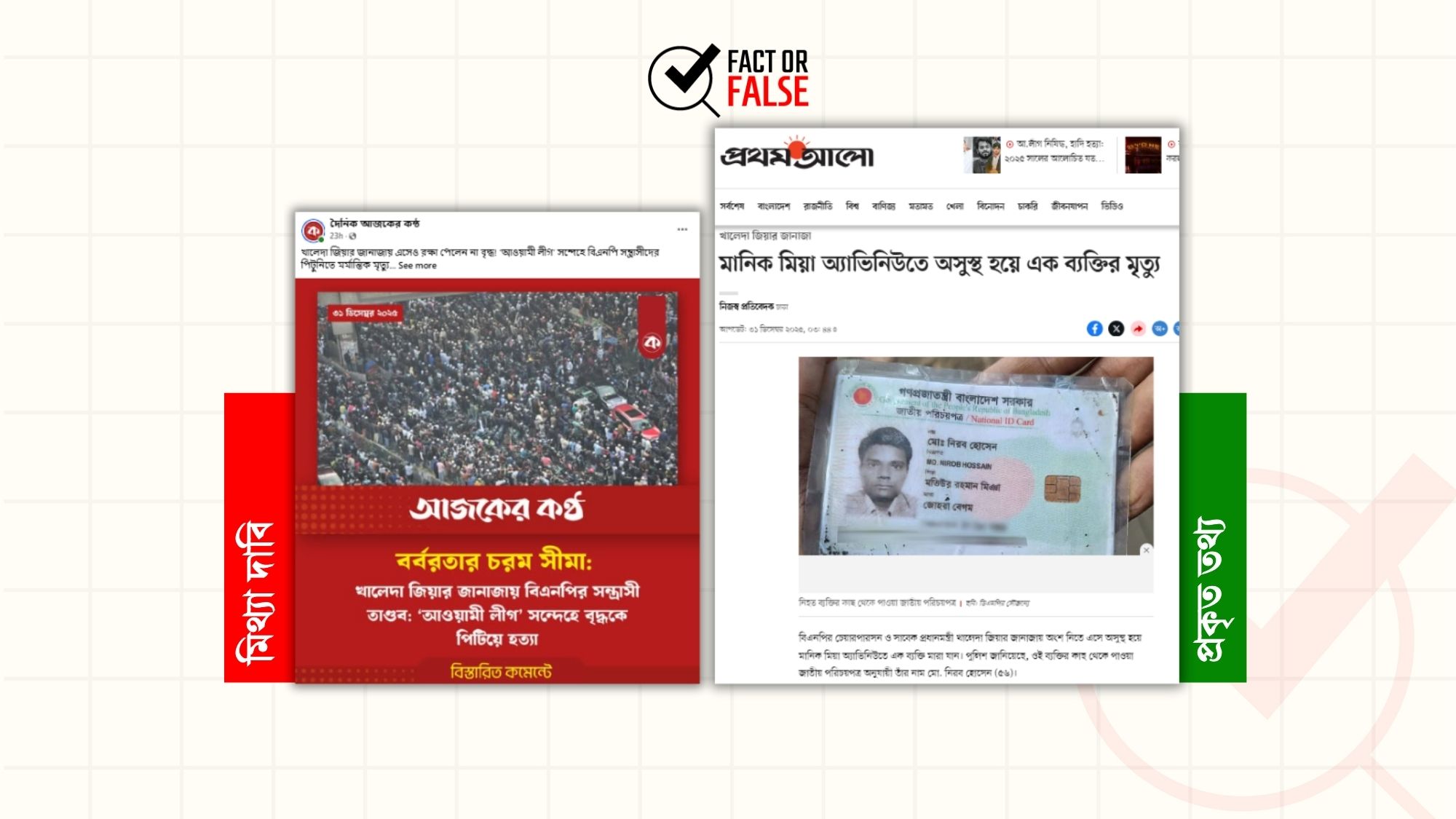 ফ্যাক্ট অর ফলস এর যাচাইয়ে দেখা যায়, সাবেক প্রধানমন্ত্রী খালেদা জিয়ার জানাজায় ‘আওয়ামী লীগ সন্দেহে বৃদ্ধকে পিটিয়ে হত্যা’র যে দাবি সামাজিক যোগাযোগ মাধ্যমে ছড়িয়েছে, তা অসত্য।