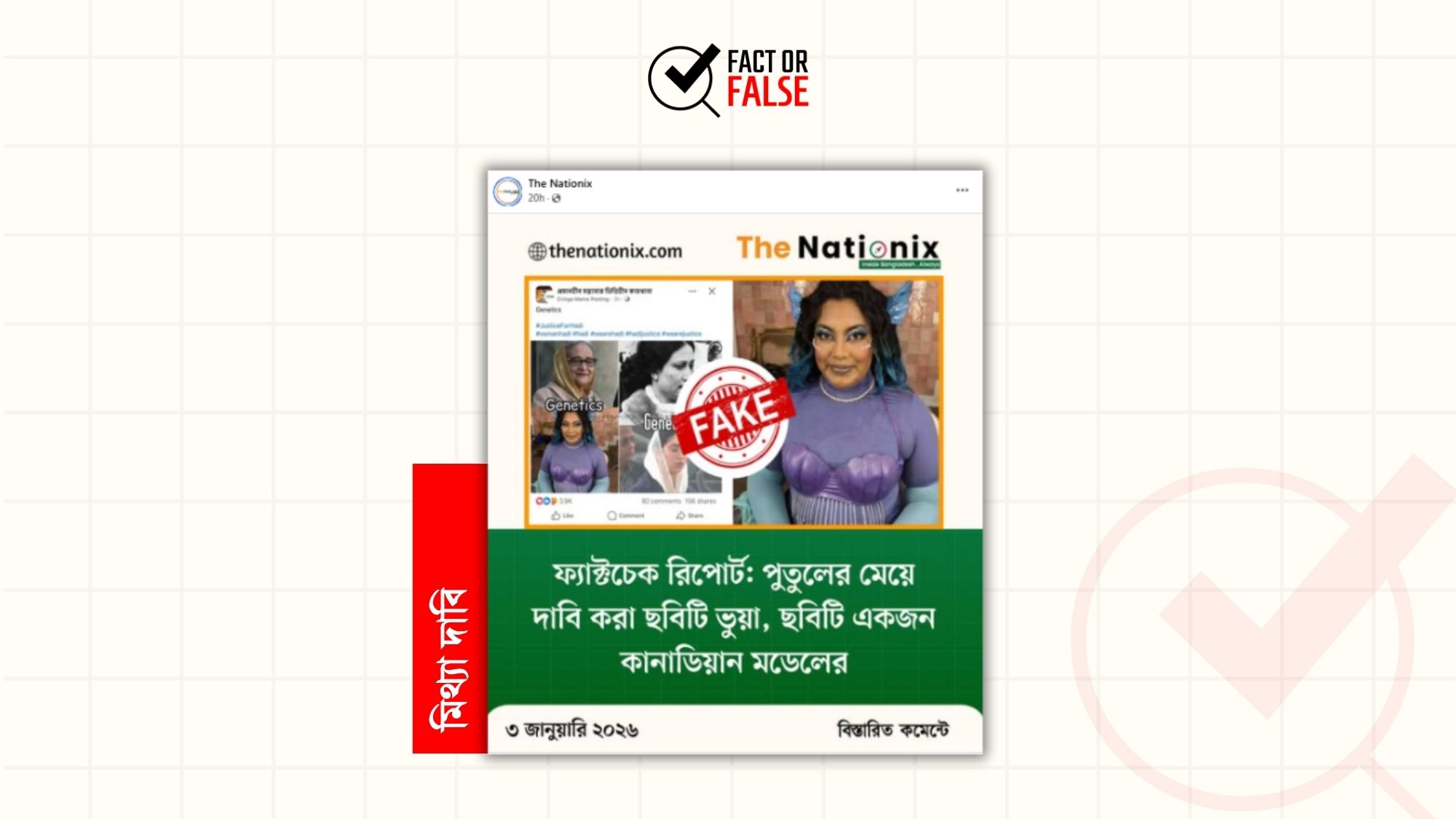 সম্প্রতি ‘The Nationix’ একটি ফ্যাক্টচেক প্রতিবেদন প্রকাশ করেছে “পুতুলের মেয়ে দাবি করা ছবিটি ভুয়া, ছবিটি একজন কানাডিয়ান মডেলের” শিরোনামে।